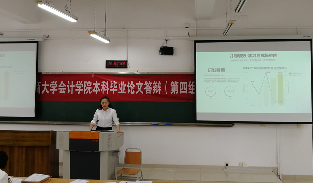 对于毕业前的最后一场“考试”,所有同学都做了充分准备。不仅穿着大方得体,制作了精美的PPT,还准备了厚厚的答辩材料,以备“挑剔”的答辩老师提问。每位学生的答辩时间控制在20分钟左右,要求学生首先结合PPT阐述了论文的选题目的、内容框架、研究方法及创新之处,随后主答辩老师对论文进行了整体评述,尤其是指出可能存在的问题,答辩组所有老师针对论文提出5-8个问题,要求答辩学生现场一一作答。整个答辩过程紧张活泼、井然有序。同学们的“论文自述”思路清晰、语言流畅、声音洪亮,针对答辩老师的提问,很多同学还能进行拓展阐述。针对需要修改的论文,答辩老师指出了其中的问题,要求学生结合答辩组的意见,在指导老师指导下继续完善,按时提交。