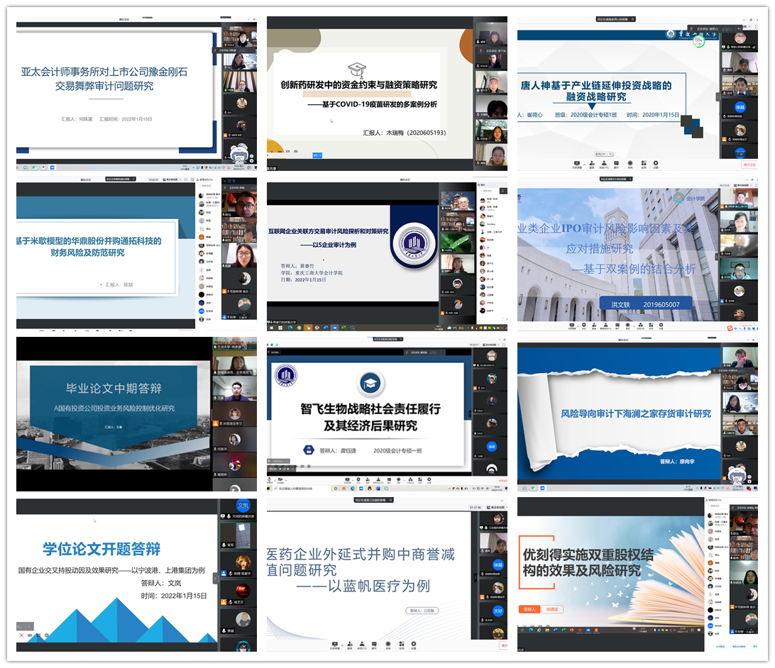 在OK138太阳集团统筹安排与部署下,研究生教育中心扎实做好线上答辩相关准备工作,保障疫情防控期间线上答辩有条不紊。本次答辩共分为12组,共122名研究生参与答辩,其中2019级中期答辩5组,2020级开题答辩7组。来自暨南大学、兰州大学、哈尔滨工程大学、西南财经大学、东北师范大学、吉林财经大学、湖南工商大学、广东外语外贸大学、北京物资学院等会计审计导师担任组长,与我校部分硕士研究生导师和事业导师共同组成答辩专家组,为同学们的论文进行强化指导。