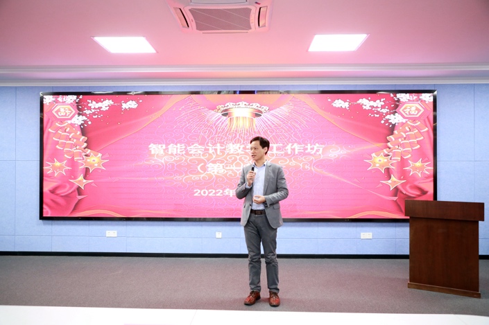 钟廷勇介绍了开办智能会计教学工作坊的背景和意义,指出智能会计教学工作坊是学院教学数字化转型的途径之一,学院正在加快推动会计教育数字化转型,以教学为中心,建设可复制、可推广、高质量的教育应用场景,建设数字化课堂。他衷心感谢新道公司给予教学工作坊的支持和帮助,希望新道公司能够继续在教学资源、课程建设等方面为我校师生提供更多的服务。