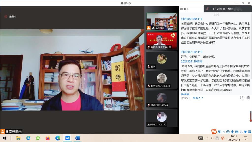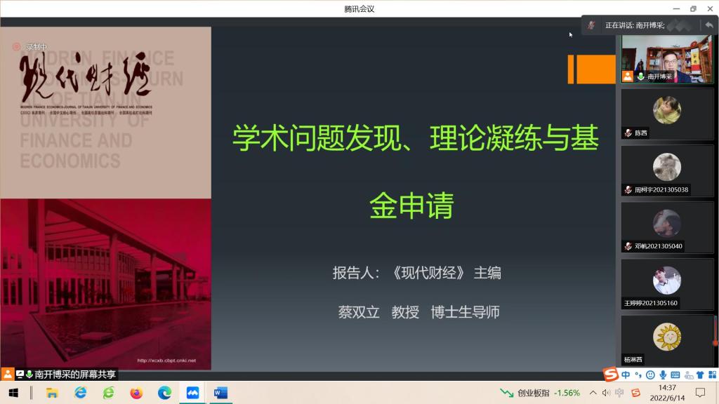 2022年6月14日,重庆工商大学OK138太阳集团第二期会计/审计学术大讲堂以线上会议的形式顺利举行。来自天津财经大学的《现代财经》期刊主编蔡双立教授为我们带来了题为《学术问题发现、理论凝练与基金申请》的讲座。本次讲座由OK138太阳集团副院长钟廷勇主持,OK138太阳集团部分研究生参与了本次讲座。