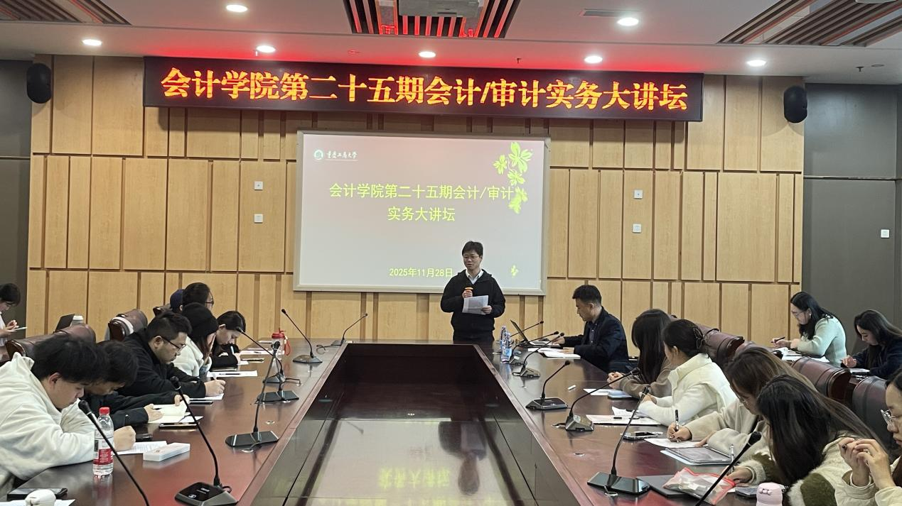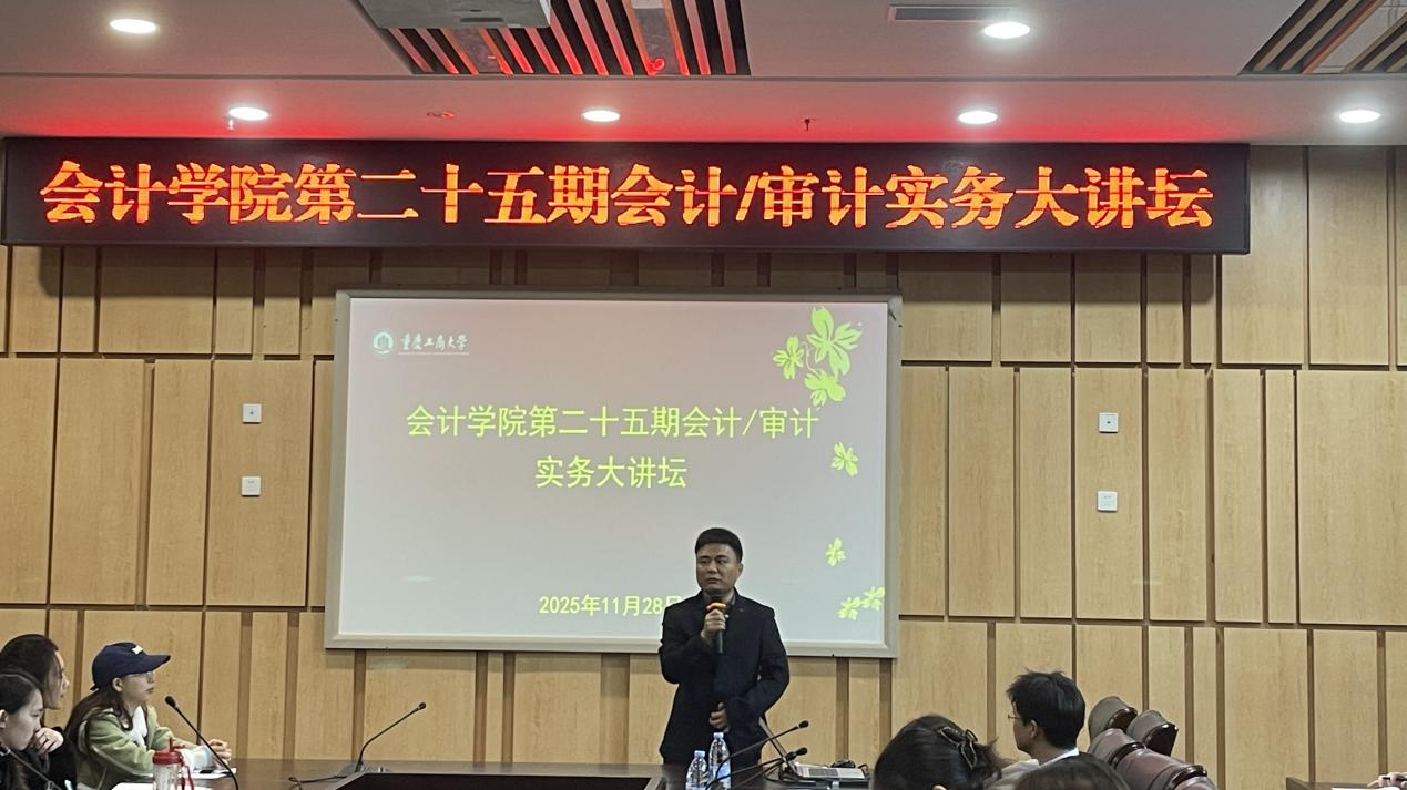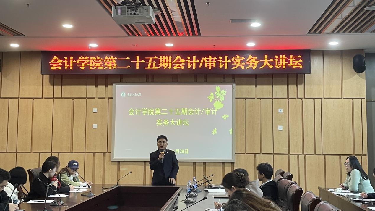 11月28日下午,重庆工商大学OK138太阳集团第二十五期会计/审计实务大讲坛在图书馆第五会议室如期举行。本次讲坛以“以专业立身,以价值致远——新时代财务人的成长之路”为主题,由OK138太阳集团韦浪博士主持,邀请重庆水务集团公用工程咨询有限公司财务负责人亓国华老师担任主讲。现场座无虚席,学院会计、审计专业的研究生们手持笔记本,时而快速记录实务案例要点,时而在财务实操细节处标注疑问,全程专注投入。
