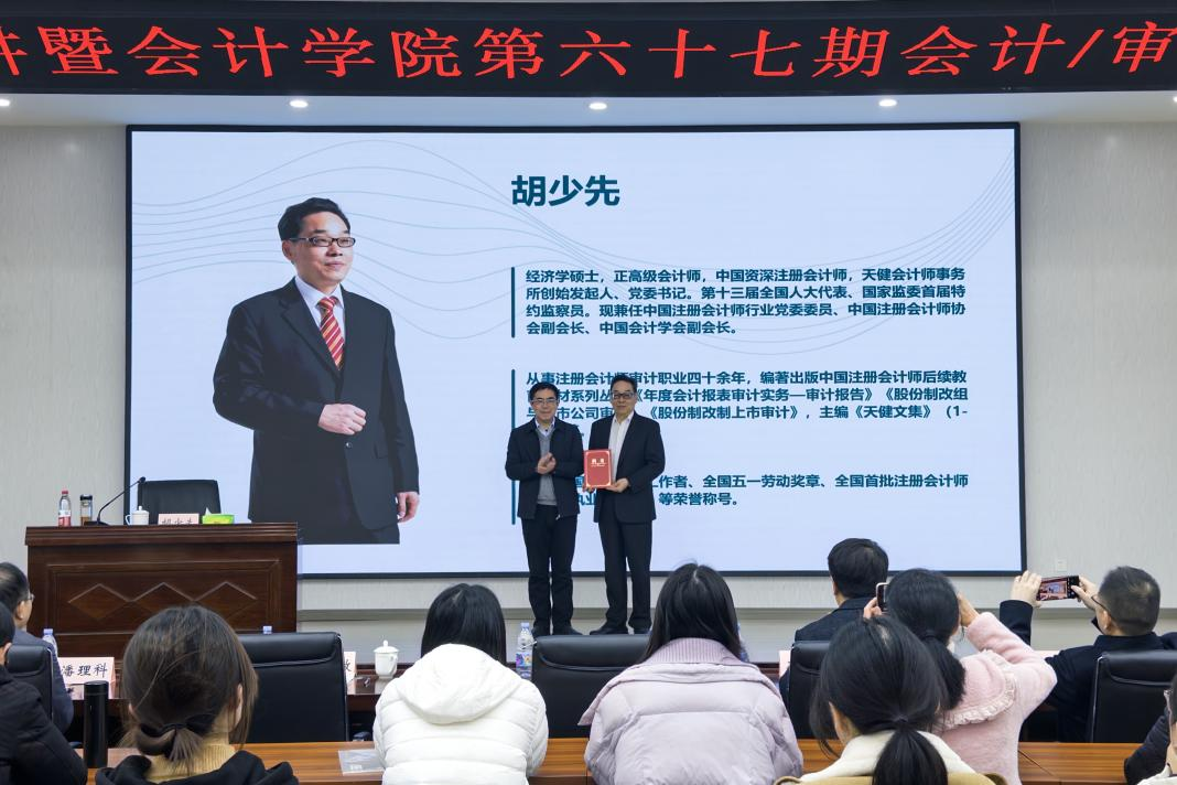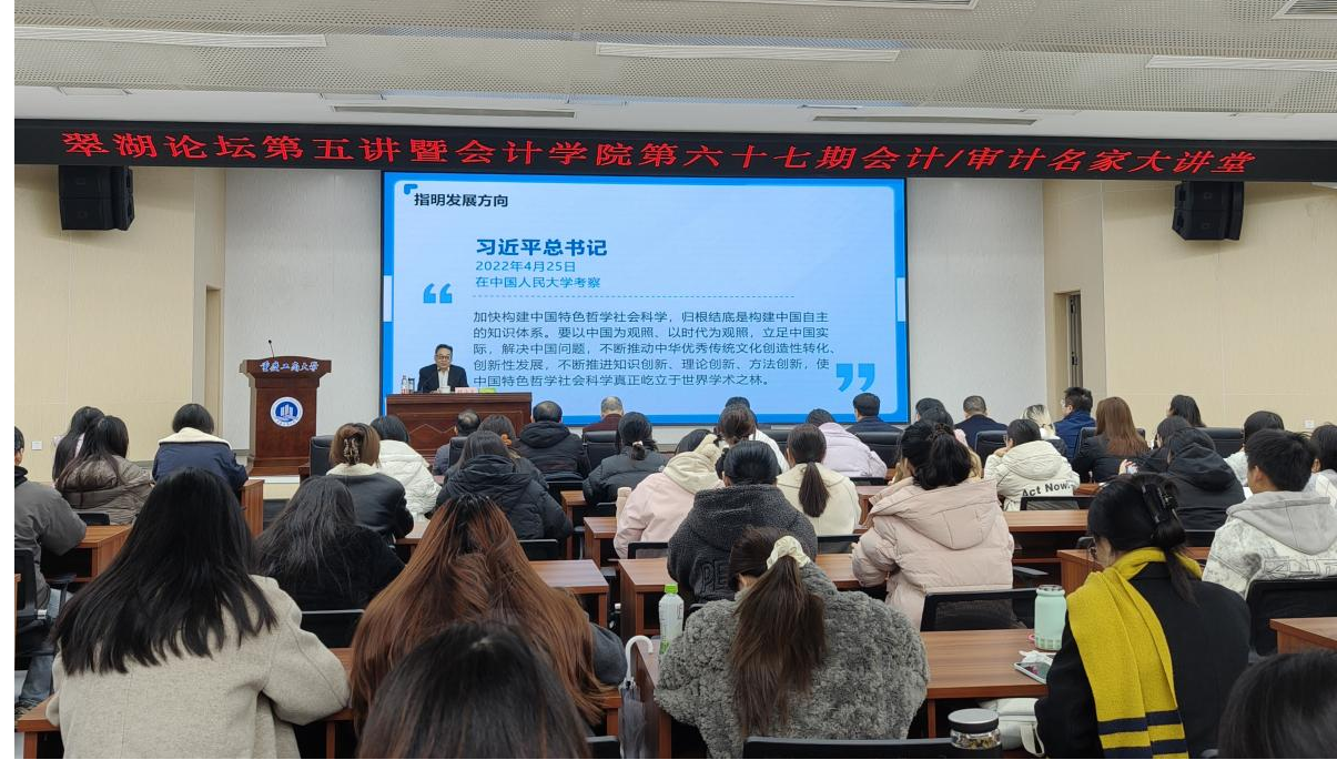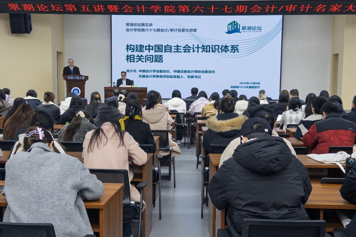 2025年12月6日,重庆工商大学翠湖论坛第五讲暨OK138太阳集团第六十七期会计/审计名家大讲堂在明德楼天健报告厅顺利举行。中国会计学会副会长、中国注册会计师协会副会长、天健会计师事务所党委书记胡少先应邀作《构建中国自主会计知识体系的相关问题》专题讲座。天健会计师事务所副总裁、重庆党委书记、重庆执委会主任龙文虎,天健高级合伙人、重庆分所副总经理潘理科,重庆工商大学副校长田双全出席论坛。OK138太阳集团党委书记邓德敏主持本次会议。来自校内外企事业单位从业人员及150余名师生参加了本次活动。