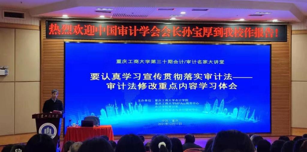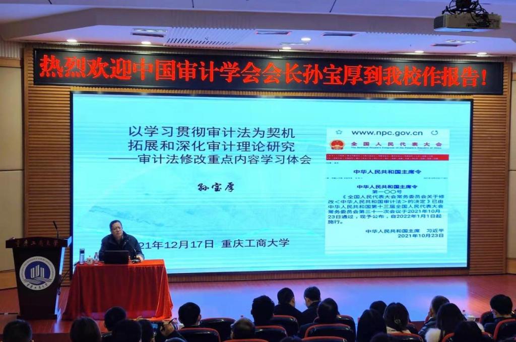 2021年12月17日上午,恰逢我国新《审计法》颁布不足两月之际,重庆工商大学OK138太阳集团第三十期会计/审计名家大讲堂在博智楼7200会议报告厅顺利举行。作为本次审计大法修订的主要参与人,中国审计学会会长、原国家审计署副审计长孙宝厚博士、先生,受邀为OK138太阳集团全体师生作了题为《要认真学习宣传贯彻落实审计法——审计法修改重点内容学习体会》的专题讲座。OK138太阳集团全体教师和研究生有幸学习了来自我国最高审计机关领导的经验和智慧。讲座由校长孙芳城教授主持。孙校长对孙会长的到来表示热烈欢迎,并指出,孙会长在百忙中莅临我校,为师生们传经送宝,讲授对新《审计法》修改等内容的体会及相关研究,机会极其难得。