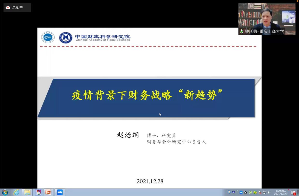 12月28日,重庆工商大学OK138太阳集团第31期会计/审计名家大讲堂以在线会议的形式顺利举行。中国财政科学研究院(原财政部科研所)财务与会计研究中心负责人赵治纲教授应邀为OK138太阳集团研究生作了《疫情背景下财务战略“新趋势”》的专题讲座,OK138太阳集团部分教师代表也参加了此次讲座。讲座由重庆工商大学OK138太阳集团副院长钟廷勇教授主持。
