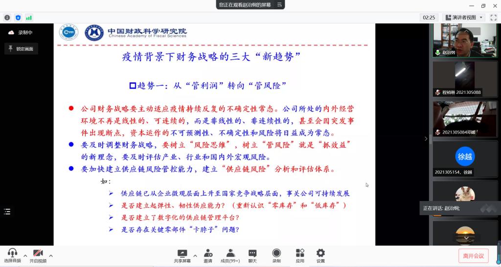 讲座伊始,赵治纲即开门见山地指出当前疫情背景下,企业财务战略展现出了三大新趋势:一是财务目标从“管利润”转向“管风险”。公司所处的内外部经营环境是非线性的、非连续的,资本运作的不可预测性和不确定性将日益成为常态。企业要及时调整财务战略,树立“风险思维”,并加快建立供应链风险管控能力。二是财务从“信息化”转向“数字化”。数字时代财务管理理念已发生巨变,指出企业应加快构建“生态型、平台型和共享型财务”。三是财务从“经济单价值”转向注重“经济社会双价值”。企业目标已从过去追求“利润最大化”演进为“相关者利益最大化”。当前疫情背景下,特别是当前科技创新和绿色发展作为国家核心发展战略的新形势下,企业需结合多方利益实现长期价值的增长和高质量的可持续发展。