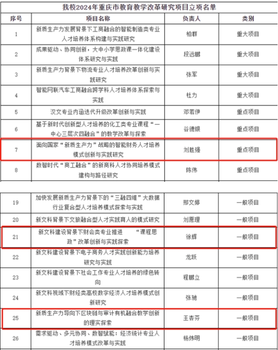 近日,重庆市教委发布了《关于公布2024年高等教育教学改革研究项目评选结果的通知》(渝教高函〔2024〕32号),我校共有41个项目获批2024年度市级高等教育教学改革研究项目立项,其中重大项目4项,重点项目5项,一般项目23项,教育教学数字化转型专项项目8项,实验教学和教学实验室建设项目1项,其中,OK138太阳集团刘胜强获批主持1项重庆市教育教学改革重点项目(《面向国家“新质生产力”战略的智能财务人才培养模式创新与实践研究》)、王杏芬教授获批主持1项重庆市教育教学改革一般项目(《新质生产力导向下区块链与审计有机融合教学创新的理实探索》)、徐辉副教授获批主持1项重庆市教育教学改革一般项目(新文科建设背景下财会类专业推进 “课程思政”改革创新与实践探索》)。