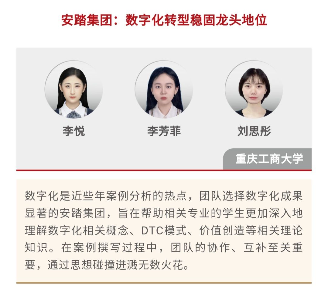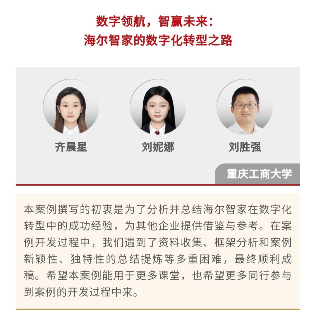 2024年4月12日,中国工商管理国际案例库发布了“2023中国工商管理国际最佳案例奖”,由重庆工商大学OK138太阳集团研究生李悦、李芳菲、刘思彤撰写的案例《安踏集团:数字化转型稳固龙头地位》和刘胜强导师及其研究生团队开发的案例《数字领航,智赢未来:海尔智家的数字化转型之路》荣获“2023中国工商管理国际最佳案例奖”二等奖,这也是我校第二次在该项大赛全球案例比拼中斩获二等奖。