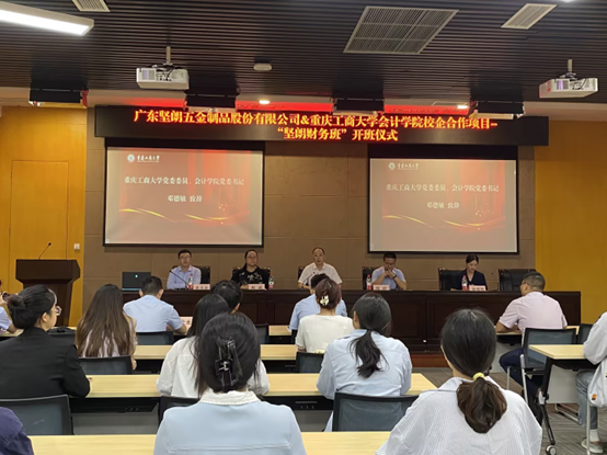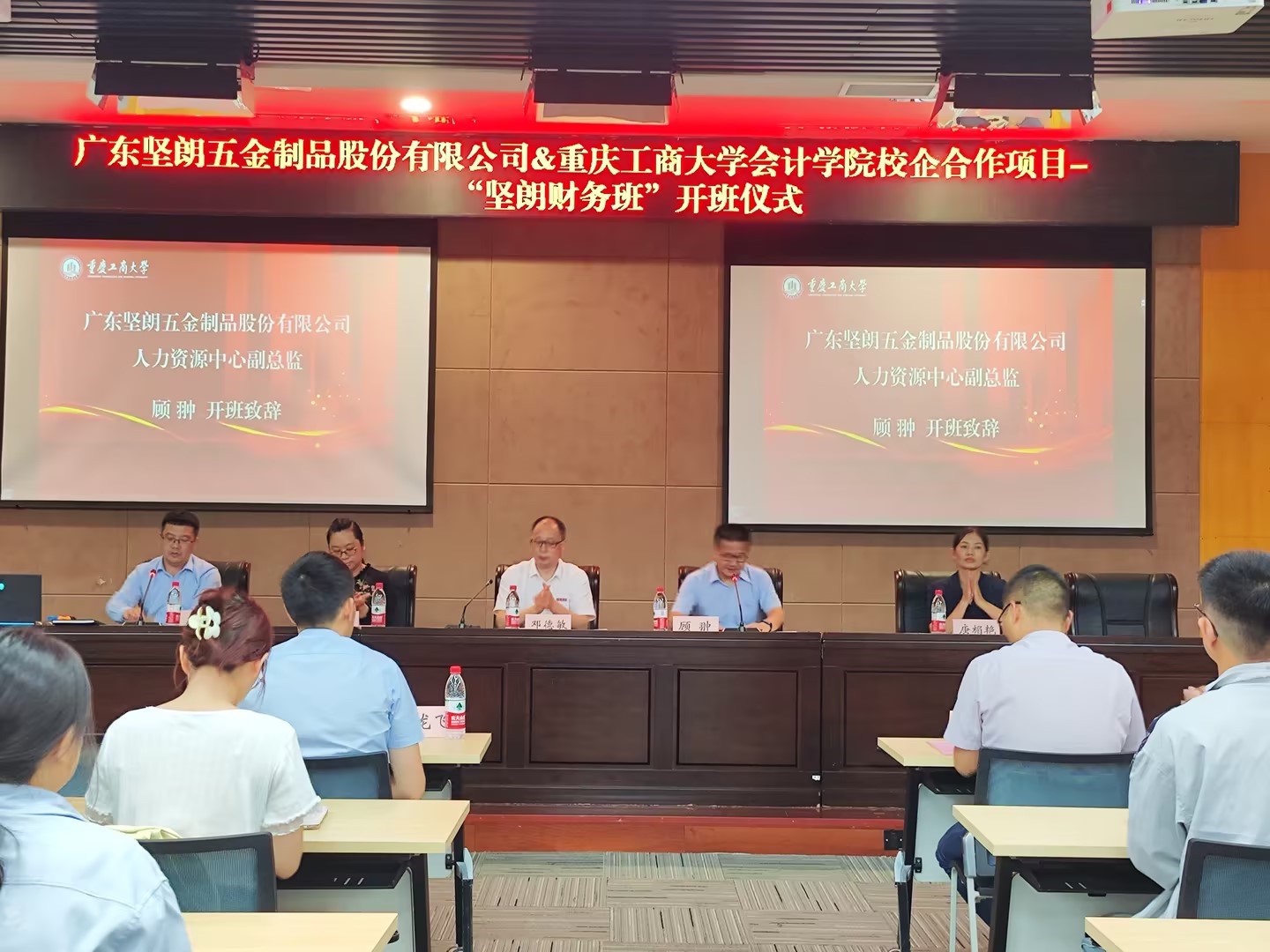 邓德敏致欢迎辞,他对广东坚朗五金制品股份有限公司给予的充分信任和支持表示诚挚的感谢,对“坚朗财务班”开班表示热烈的祝贺。他详细介绍了学院的办学历史、学科建设情况、师资力量、学生概况等,他表示,今年5月24日学院领导带队赴坚朗公司开展“访企拓岗”活动并签署了双方合作协议,“坚朗财务班” 是落实“访企拓岗”成果和合作协议内容的重要举措。订单班的设立得到了学院各级领导的大力支持和帮助,希望能与坚朗公司一起培养出高素质的应用型财会专业人才,也希望同学们珍惜学习时光,勤于思考、善于总结、积极探索。