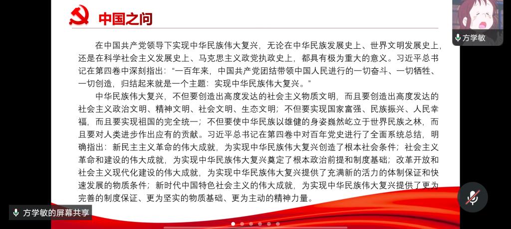 方学敏同学从“四大之问”(中国之问、世界之问、人民之问、时代之问”)入手,带着支部党员们学习了《习近平谈治国理政》第四卷的内容。《习近平谈治国理政》第四卷收入了习近平总书记在2020年2月3日至2022年5月10日期间的讲话、谈话、演讲、致辞、指示、贺信等109篇,分为21个专题, 生动记录了以习近平同志为核心的党中央团结带领全党全国各族人民应变局开新局的伟大实践,汇集了一系列原创性的治国理政新理念新思想新战略,科学回答了“中国之问、世界之问、人民之问、时代之问”(简称“四大之问”),深刻阐发了中国之路、中国之治、中国之理,集中展示了马克思主义中国化时代化的最新成果,为我们开启了“思想之窗”,开辟了“复兴之路”。所以我们从“四大之问”入手,能够深刻领悟把握《习近平谈治国理政》第四卷的思想体系、核心要义和实践要求,增强“四个意识”、坚定“四个自信”、做到“两个维护”,推动学习贯彻习近平新时代中国特色社会主义思想走深走实。