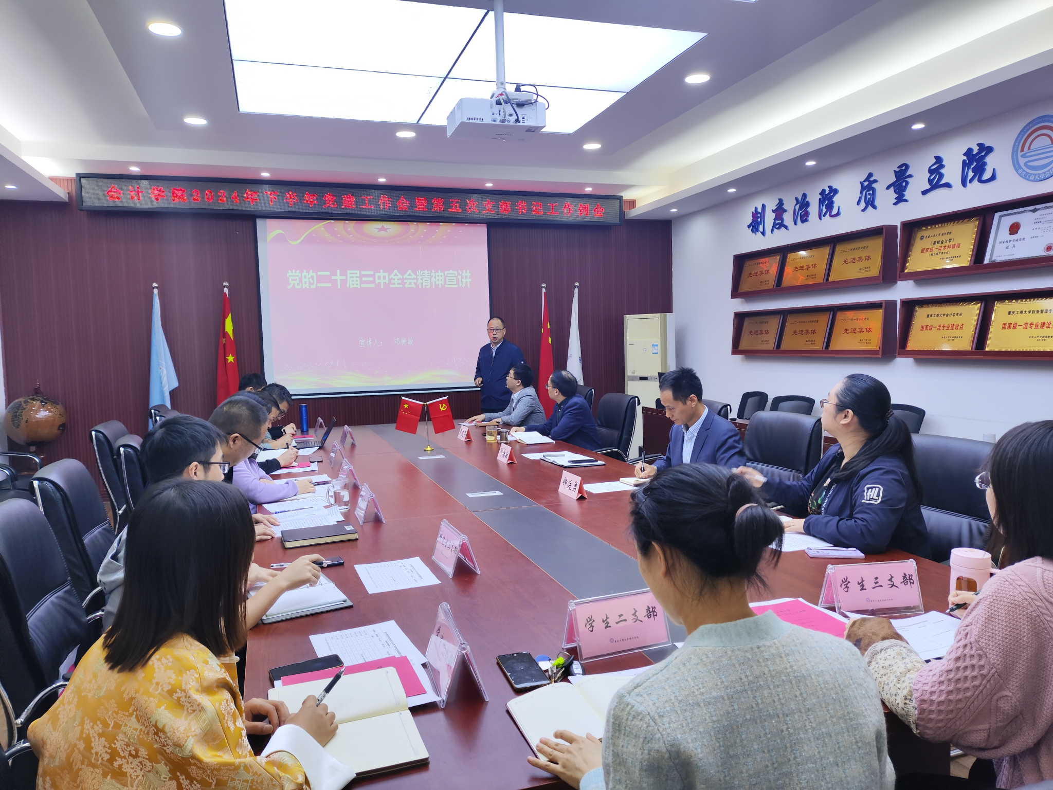 会上,邓德敏书记布置了下半年学院党建重点工作,强调学院党建工作要坚持高质量、高标准,党建与业务要高度融合,充分发挥党建引领作用,并重点开展好以下工作:一是学习宣传贯彻好党的二十届三中全会精神,开展好全会精神的校园宣讲工作;二是要高度重视校党委第四轮巡察,全力配合并做好相关工作;三是凝心聚力做好本科教育教学审核评估工作;四是全力以赴做好会计学硕和会计专硕学位点周期性合格评估工作。
