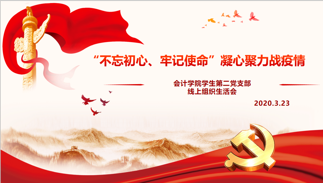 2020年3月23日,会计学院学生第二党支部召开了线上组织生活会,会议由支部书记付海南同志主持,支部全体党员参加。本次会议共有三部分内容组成。首先,支部书记付海南带领大家共同学习《习近平总书记在统筹推进新冠肺炎疫情防控和经济社会发展工作部署会议上的讲话》、《习近平总书记在决战决胜脱贫攻坚座谈会上的讲话》。支部书记强调我们要把全面贯彻落实习近平总书记重要讲话精神作为增强“四个意识”、坚定“四个自信”、做到“两个维护”最现实的检验,作为防范化解重大风险、提高制度执行力和治理能力最重要的实践。支部全体党员要不忘初心、牢记使命,增强忧患意识,坚定必胜信心,以更顽强的意志持续作战、英勇奋战。