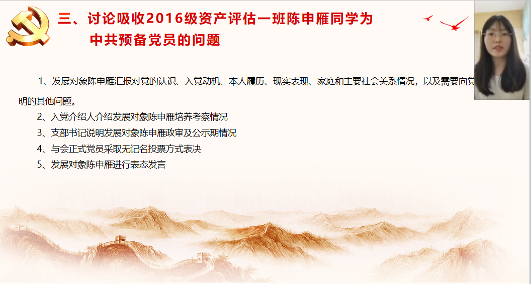 会议第三部分是讨论吸收2016级资产评估一班陈申雁同学为中共预备党员的问题。陈申雁同学向支部党员阐明了自己对中国共产党的认识、自己的入党动机及在校表现等问题,其政审合格、公示期间未收到任何负面反映,经支部大会全体正式党员无记名投票表决,同意吸收其为中共预备党员。