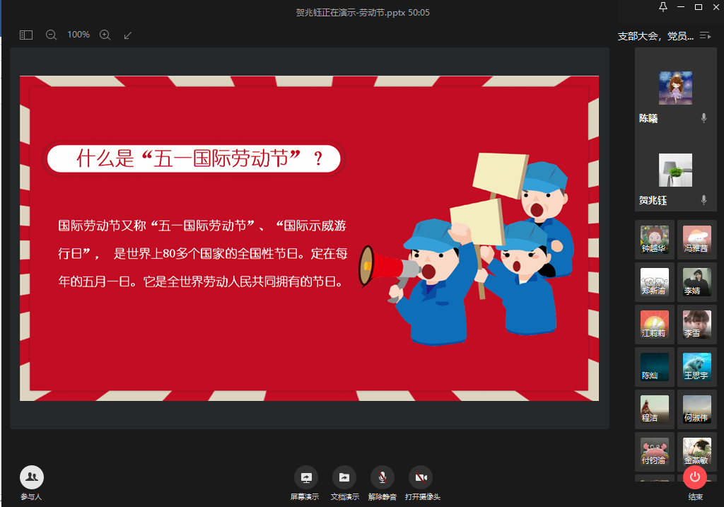 2020年5月1日11:00,学生第三党支部在线开展了主题为“劳动教育”的党日活动,支部书记陈曦老师,程洁老师以及三支部全体学生党员参加了此次活动。