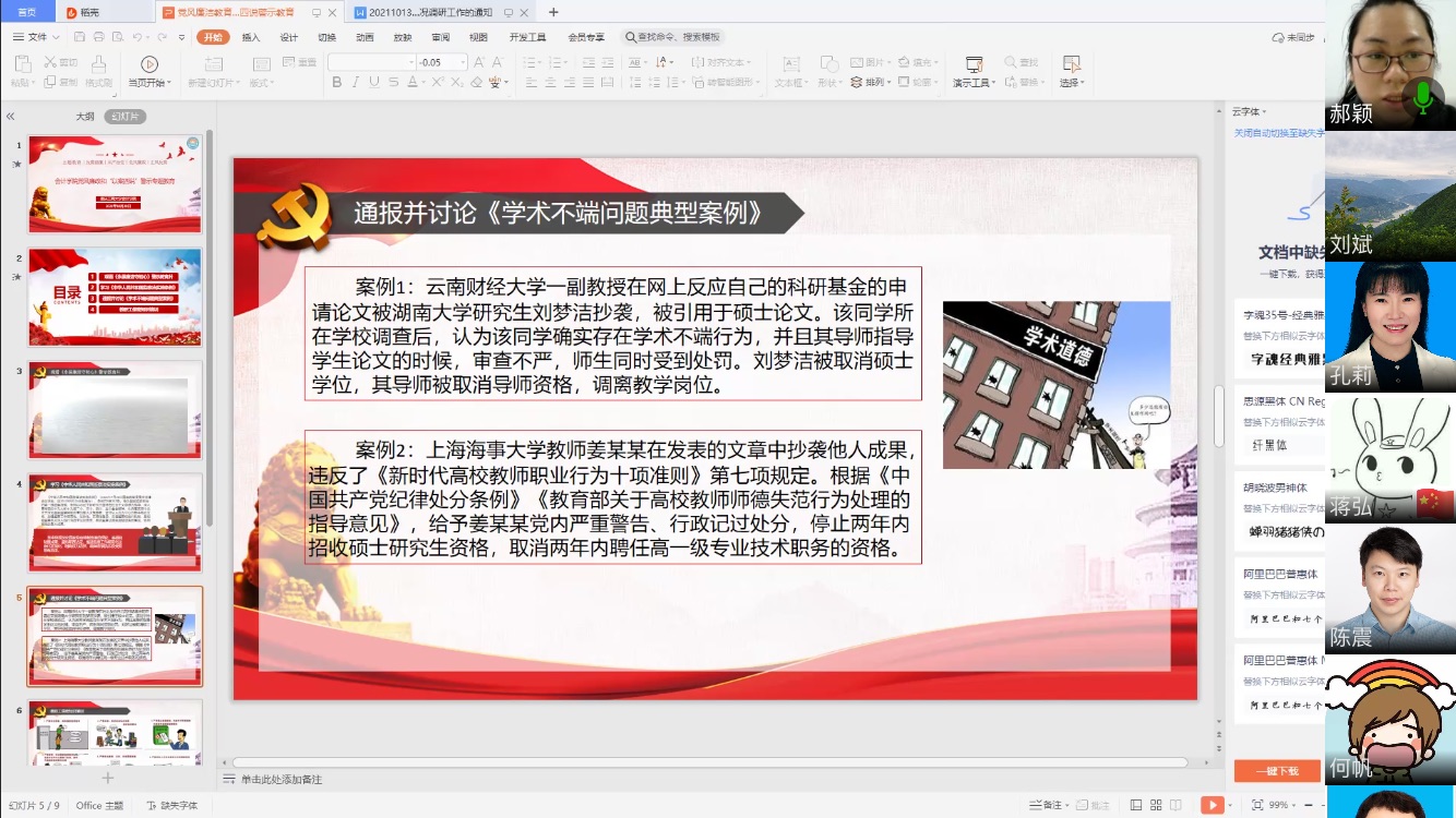 今天的会议让大家都深受启发,线上讨论热烈。纪委委员蒋弘认为,学生和老师最难克服的事情往往不是在业务能力上难以提升而是面对压力和诱惑时不去踩踏道德和法律的红线。学生为什么抄袭,想早点毕业、想早点工作、想早点挣钱;老师为什么抄袭,想考核过关、想职称评定、想奖项申报。我们经常看到和听到,一些人毕业了、工作了、甚至退休了,他的一些不堪的陈年往事和个人秘密被人民群众从历史中翻查出来,最后弄得晚节不保,结果就是“眼看他盖高楼,眼看他宴宾客,眼看他楼塌了”。所以,学生和老师坚持思想上的底线,就是在给自己一个完整、正常、稳定的人生。财务管理系主任蒋水全表示,高校党政廉风建设最重要的内容之一是防治学术不正之风。作为高校教育工作者,一是要以身作则,杜绝学术不端行为;二是作为本科学业导师、研究生导师要引导学生学术价值观,不为了做学术而做学术,同时要多次检查学生学术成果和论文数据,防止学术不端;三是学校应该建立学术不端检查复查机制,全方位打击学术不正之风。