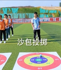 2.每组五人参赛,共五组,手持沙包,对准靶盘的积分进行投掷,每位队员每人投掷1次。沙包的最终落点处为本次投掷得分。