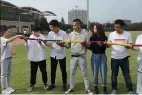 4.将球运输至指定位置,哪一队率先将球落入拓展杯中,哪一队获胜!