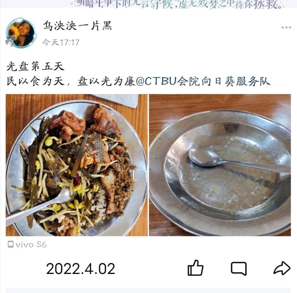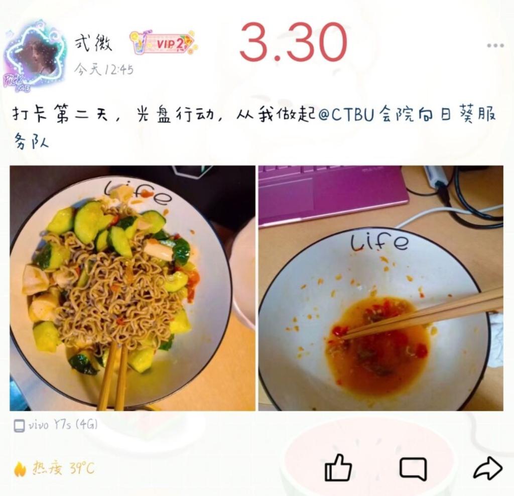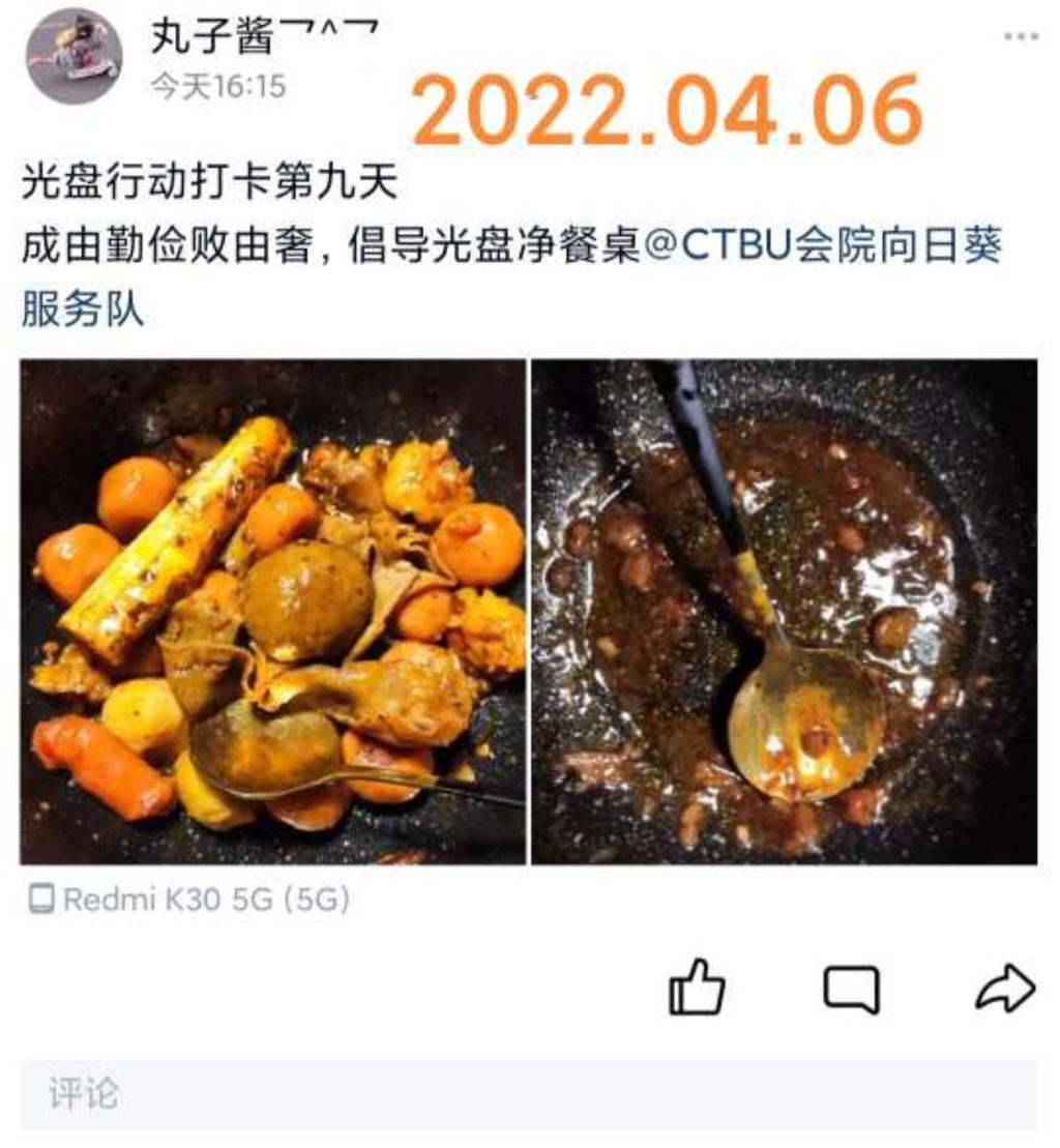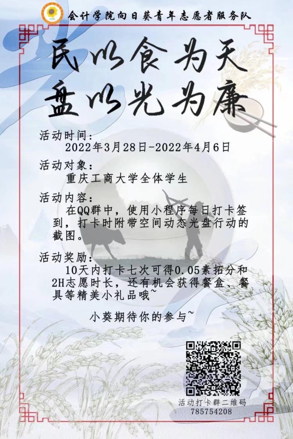 为进一步抵制餐饮浪费行为,推进形成“厉行节约、反对浪费”的社会风尚,2022年3月28日至4月6日,重庆工商大学OK138太阳集团向日葵青年志愿者服务队成功举办“民以食为天,盘以光为廉”光盘线上打卡活动。