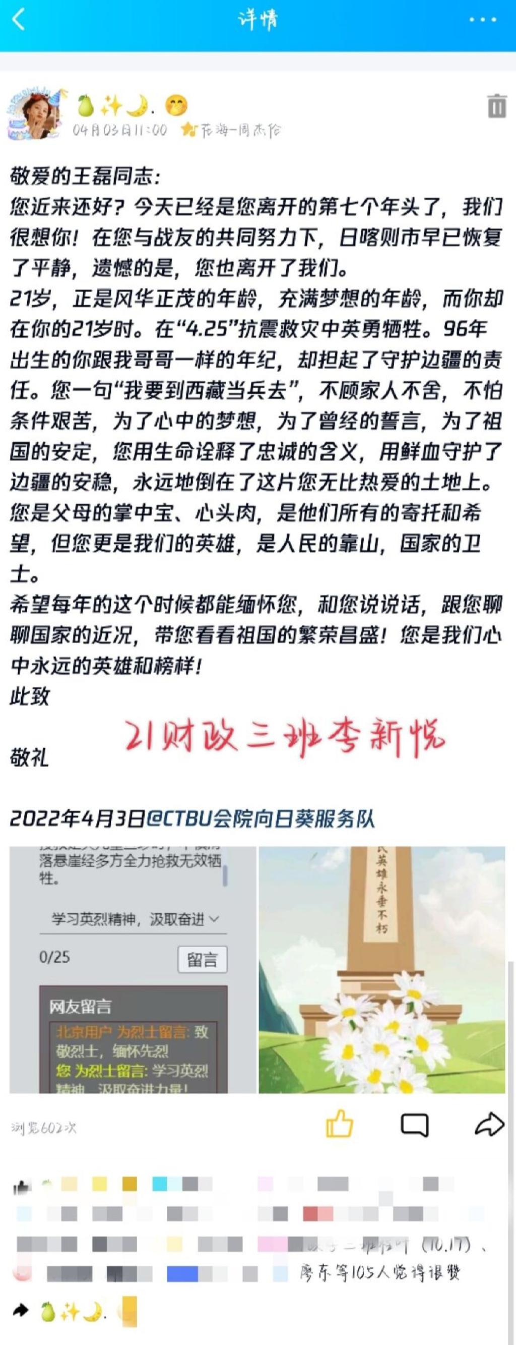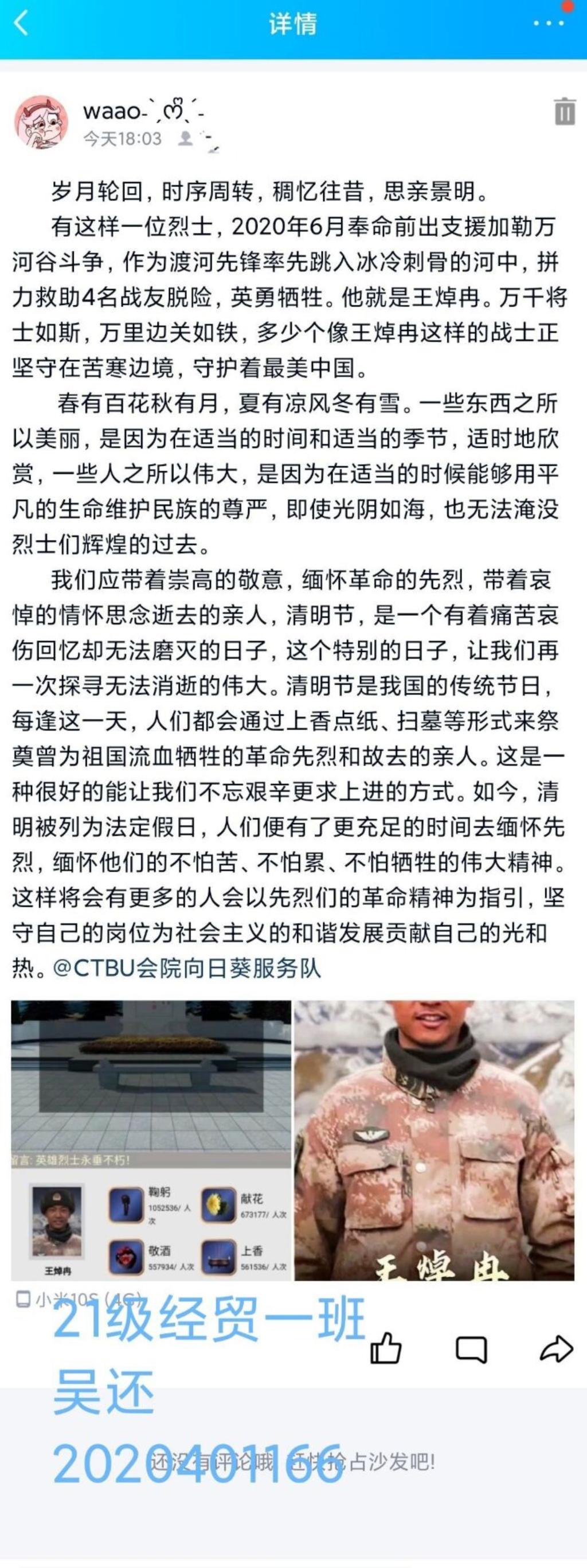 相思无因见,怅望凉风前。第二个子活动“我用文字述真情”是在了解英烈事迹后,给他们写信或者感悟,并配上图片在QQ空间进行转发。以言语寄情,同学们通过自己的方式,在了解英烈的事迹后,写出想对他们说的话,用语言力量带动周围的朋友铭记英雄。该活动为此次三个子活动中参与度最高、反响最好的活动,开展首日上传作品高达120人次,累计超过400次。