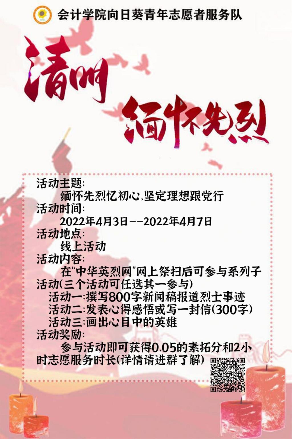清明节气,新草青青;纷纷雨滴,丝丝牵挂。重庆工商大学OK138太阳集团向日葵青年志愿者服务队于2022年4月3日至2022年4月7日举办了“缅怀先烈忆初心,坚定理想跟党行”清明线上祭扫活动,旨在让同学们更加深刻的去认识先烈为我们后辈做出的牺牲和贡献,增强大学生内心深处对祖国建设的使命感。