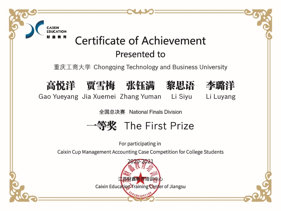 入校以来,荣获国家奖学金、全国大学生数学竞赛一等奖、“财鑫杯”管理会计案例大赛一等奖等5项国家级奖项;重庆市三好学生、“互联网+”大学生创新创业大赛重庆赛区铜奖等6项省级奖项;综合一等奖学金、优秀学生等20余项校级奖项以及征文比赛二等奖等院级奖项。