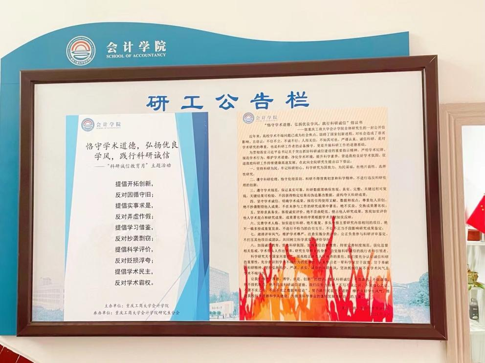 倡议书宣传学术诚信理念。学院在研工公告栏张贴科研诚信教育倡议书和海报,进行学术诚信的宣传, 海报和倡议书简单明了,直击人心,从根本下手,维护学术道德,规范学术行为,预防学术腐败,严明学术纪律,告诫同学们要自觉遵守学术规范。