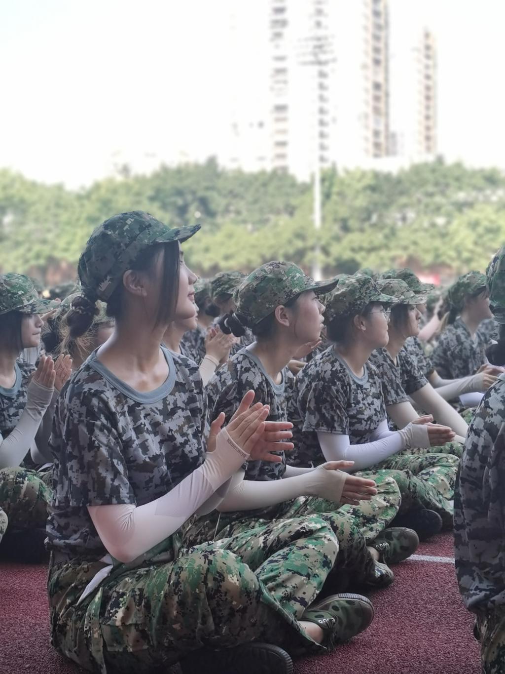 阳光明媚,学子们都面对阳光在站军姿。重庆七月的太阳,晒在皮肤上是干干的,眼睛都睁不开。这是我深有感触的。但无论谁都没有退缩,在跟太阳作战。在站军姿中,学子们付出努力越高就站得越好。齐步、跑步,敬礼等训练都是很耗体力的活动,只要认真去做就能走齐、跑齐。内务训练亦如此,就拿叠被亦是如此,压被压的时间长,被就薄;扣被扣的时间长,被就能更好成形。