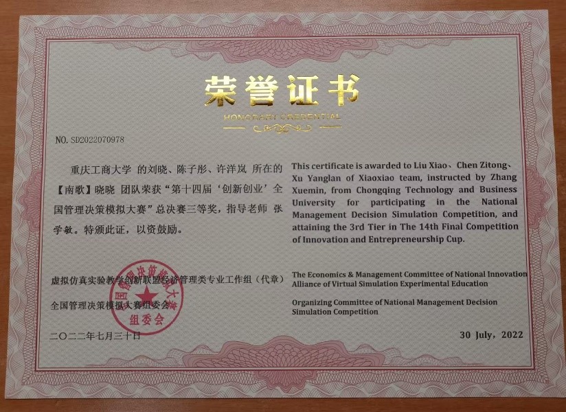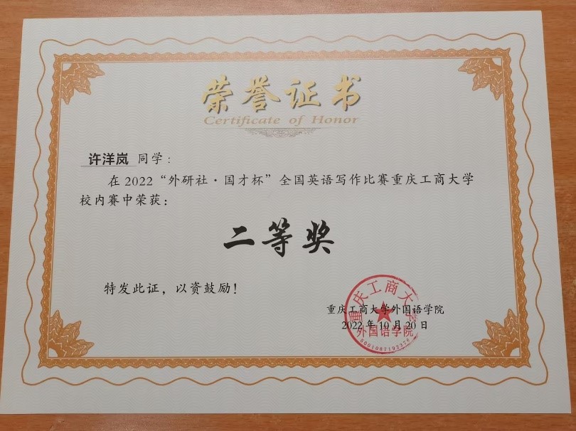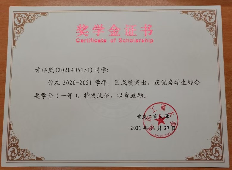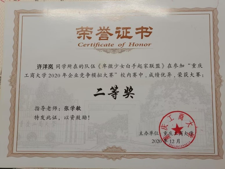 许洋岚,2020级ACCA专业,2021-2022学年平均学分绩点4.16,荣获2021-2022学年会计之星——学习之星称号,连续两年获得综合一等奖学金和学习优秀奖学金,在校期间共获国家级奖项1次、省部级奖项1次、校级奖项8次、院级奖项3次。