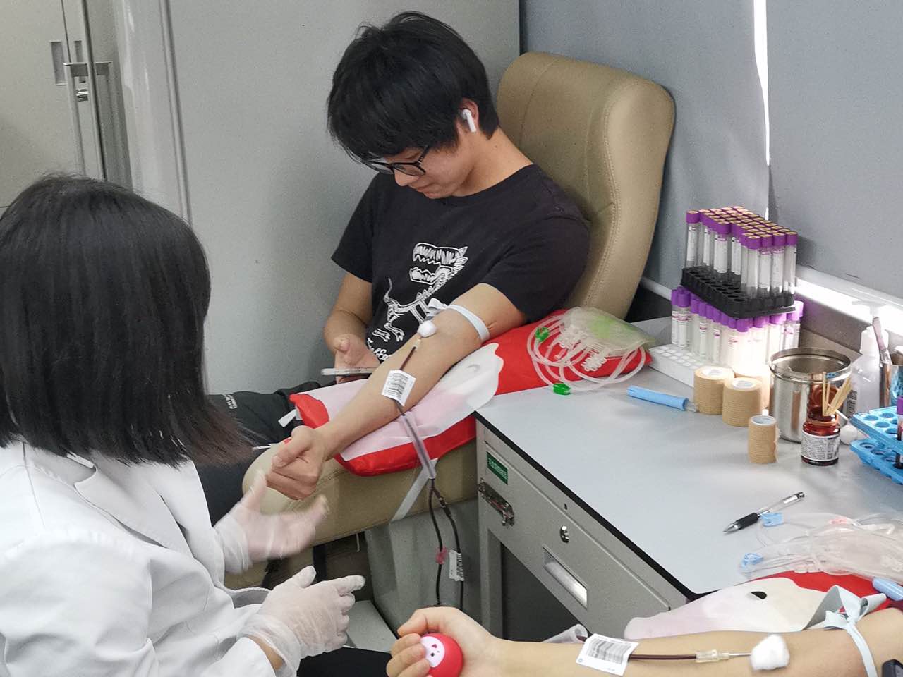 许多同学都是首次参与献血,面对粗长的针管,他们都克服了内心的害怕与不安,勇敢地完成了献血。特别是活动中献血的几位女同学,在填写献血信息表时,毫不犹豫地勾选了400mL的选项,面对志愿者的反复询问,她们都坚定不移。此次参与献血的人员不单只有学生,还有教职工,他们献出自己的鲜血,将爱与希望延续,通过血液滋润另一个生命,绽放出新生的活力!