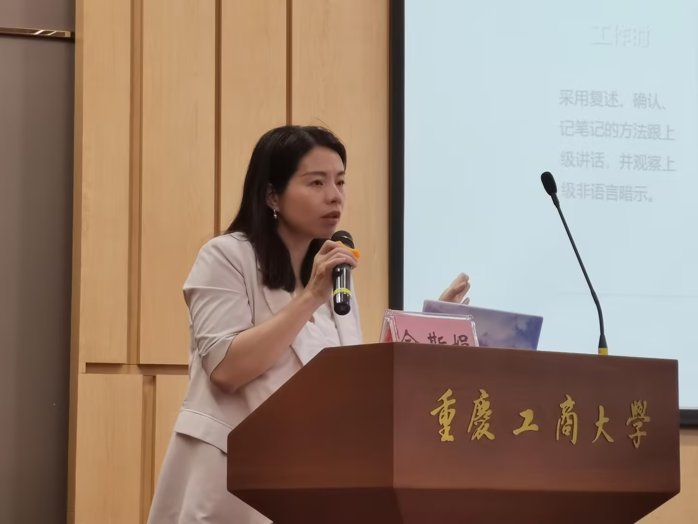 最后,大信谛威人力资源部总监佘斯娟女士进行第一期“沟通与表达技巧”主题讲座。讲座从五个方面进行,一、沟通的基础;二、倾听的艺术;三、沟通的策略;四、横向与纵向沟通;五、沟通技巧与演练。在讲座中,佘女士对沟通的重要性、倾听的层次等多方面进行强调,并通过实际案例训练营员的表达能力。讲座效果良好,学生给予高度评价。