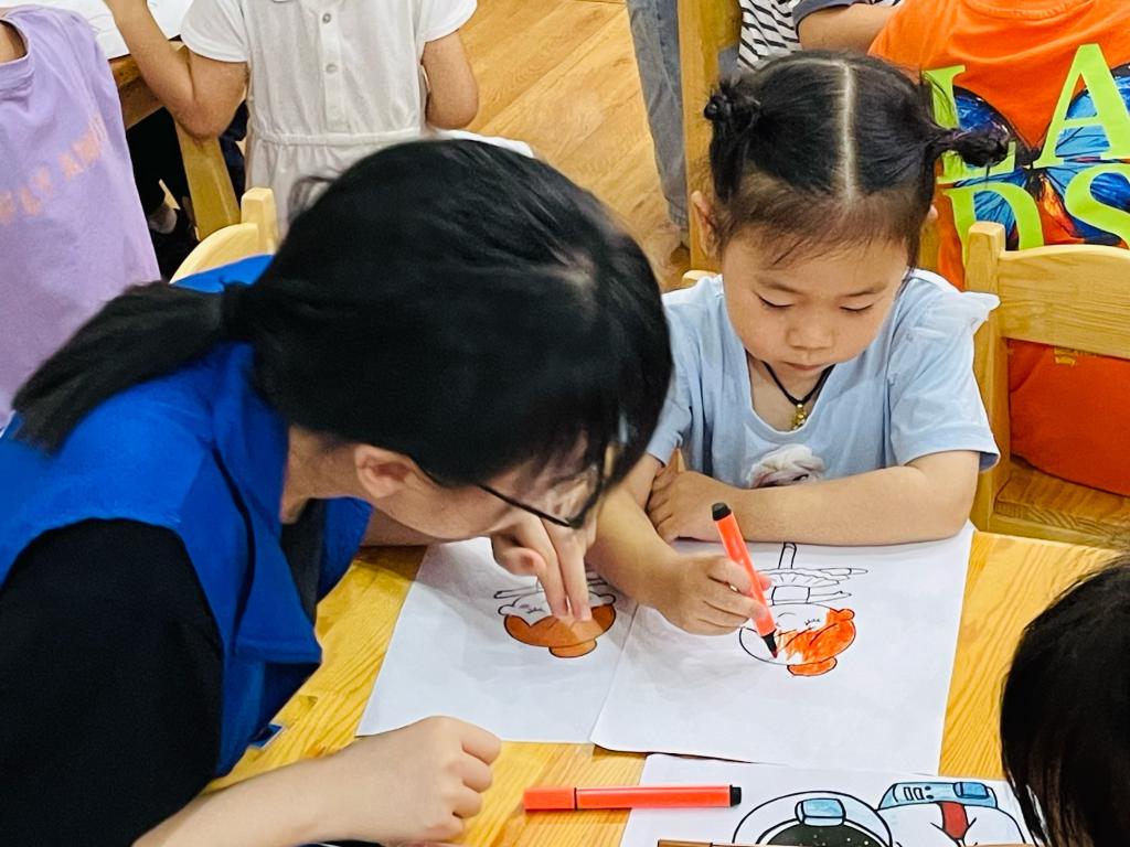 “将未来理想填色”,本次课程将美育教育与小朋友们的未来职业理想挂钩。志愿者老师首先介绍了常见的职业,让小朋友们畅所欲言,分享了自己的理想,并且简明扼要地讲解了色彩搭配的适配性等美学知识。志愿者团队在本次课程开始前打印了数十种职业的线稿,课堂上让小朋友们选择了自己当下最憧憬的职业进行填色。小朋友们充分发挥了自己的想象力和创造力,用彩笔填充了自己的理想。