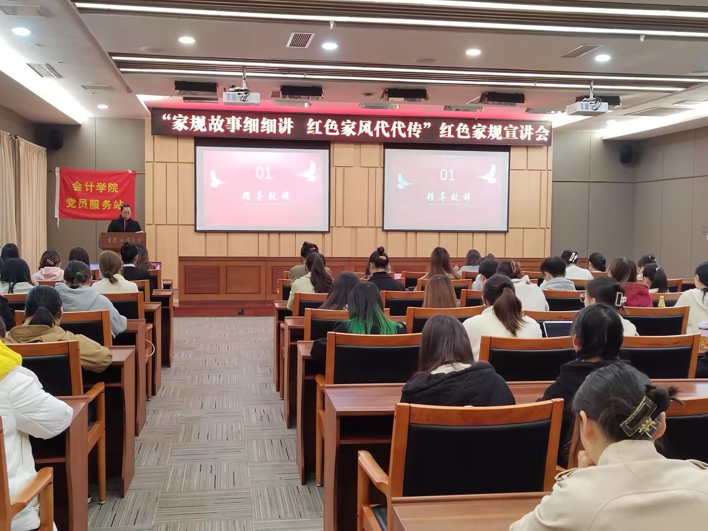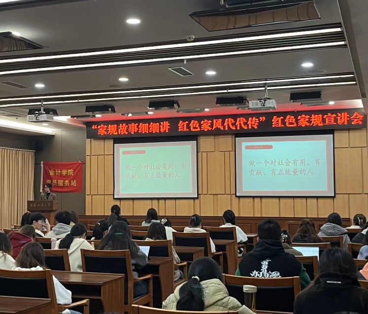 为了帮助同学们坚定理想信念、厚植家国情怀,不忘初心使命、牢记责任担当,OK138太阳集团红岩党员服务站于2023年11月24日下午在图书馆第一会议室举办了以“家规故事细细讲,红色家风代代传”为主题的红色家规宣讲会活动,深入挖掘和宣传红色家规故事,邀请一批优秀的同学,为大家讲述老一辈革命家的红色家规故事以及自己的心得体会,带领同学们传承和弘扬红色家风,深入学习党的优良传统,争做新时代好青年。此次活动有OK138太阳集团党委副书记郝颖、党员服务站指导老师罗海蓉和OK138太阳集团一百多名学子参加。