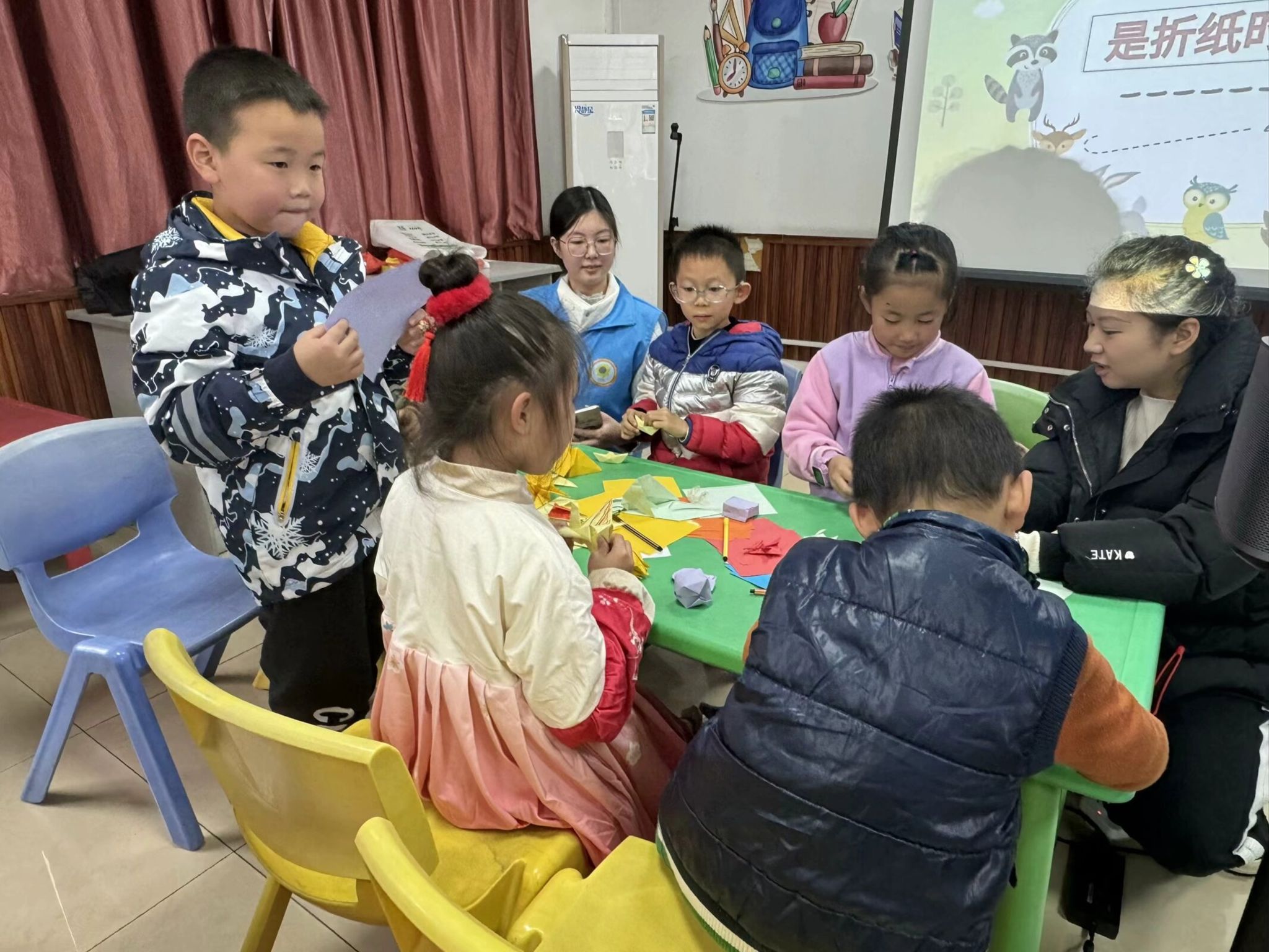 下午2时30分,活动正式开始,首先由主持人为小朋友们讲解动物保护相关知识,紧接着开展了 “小动物知多少”问答环节,小朋友们认真思考,稚嫩童真的话语令此环节趣味盎然。问答环节结束后,小朋友们还意犹未尽,主持人接着开始了“动物蹲蹲蹲”的互动小游戏,每个小朋友使用不同的动物代称,通过叫某某动物蹲的方式,被指定到的动物要开始下蹲,坚持到最后的小朋友获胜,在游戏中各位小朋友各显神通,争做游戏的大赢家,玩得十分投入。在欢声笑语中,活动进行到最后的重头戏——折纸。活动现场,我们看到志愿者们温柔的笑容,小朋友们或慢腾腾或灵活的手指,他们专注的眼神透露着对小动物的喜爱和亲近,时间不知觉地溜走了,小朋友们折出了各种各样的小动物,有生动活泼的小猫咪,憨态可掬的小胖鸟,威武霸气的霸王龙……活动最终定格在了大家的笑脸上。活动圆满结束,小朋友和志愿者们一同在折纸艺术的海洋徜徉,放飞人类与动物和谐相处的美好希望。