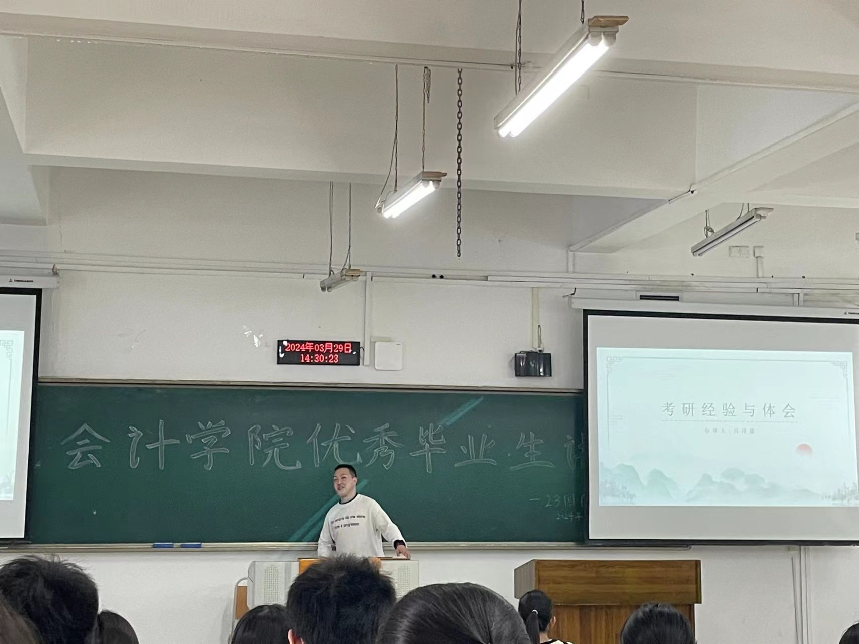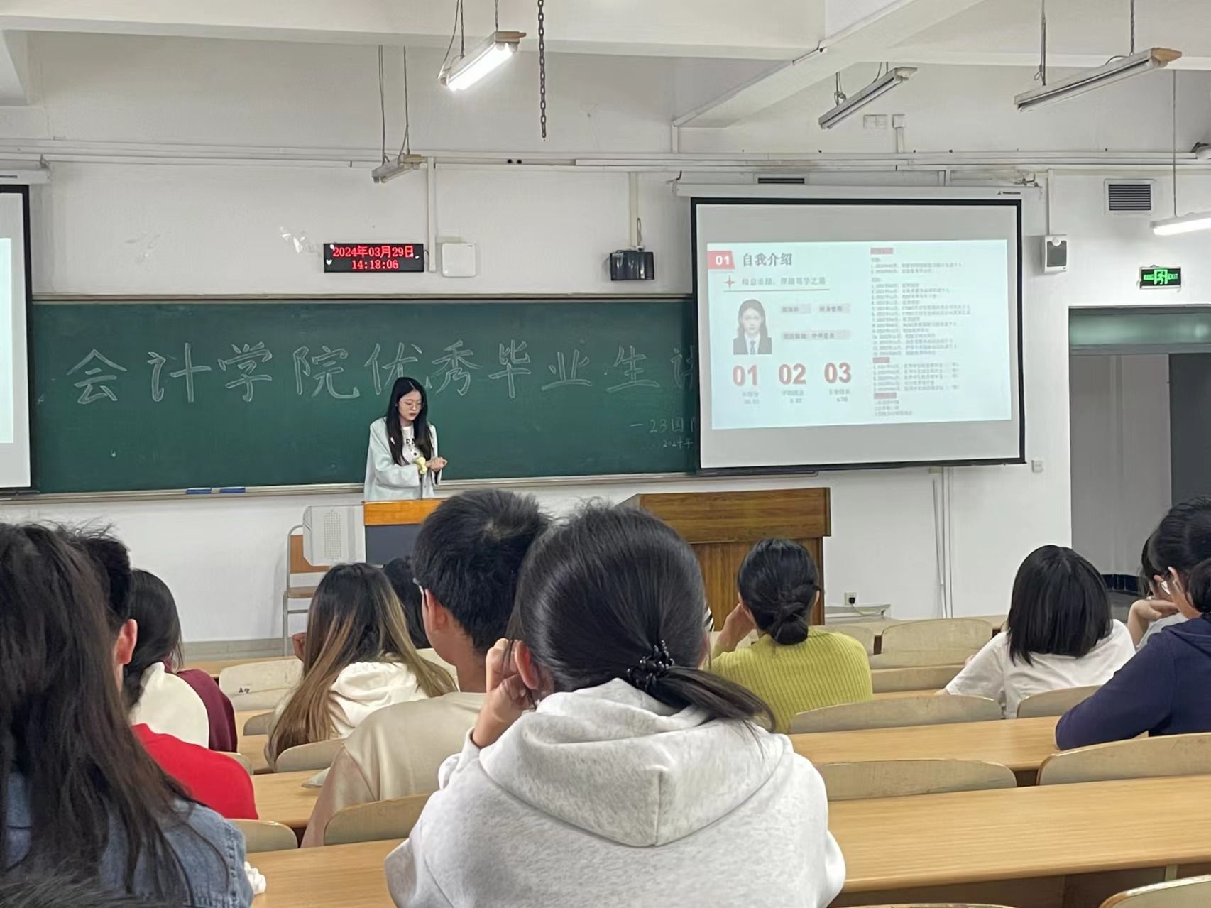 宣讲会上,三位优秀毕业生结合自己的专业学习、实习历程、科研竞赛经验以及考研留学情况进行了分享和展示。首先,20级智能会计专业的肖嫣然结合自身学习经历和留学申请情况,建议学弟学妹们尽早了解留学政策,加强自身专业课程学习的同时,利用课余时间通过雅思、托福等考试。随后,20级财务管理专业的陈瑜昕与同学们分享了大学期间学习方法,鼓励同学们积极参加实践活动和科研竞赛,积累校外实习经验,充实校内工作经历和项目经历,学习课堂之外的技能,更强调了学分绩点与科研竞赛活动对自身发展的重要性。最后,20级财务管理专业的吕泽僖总结了自己备考研究生考试的经验,从考研择校、复习方法、心态调整等方面分析了自己考研成功的秘诀。