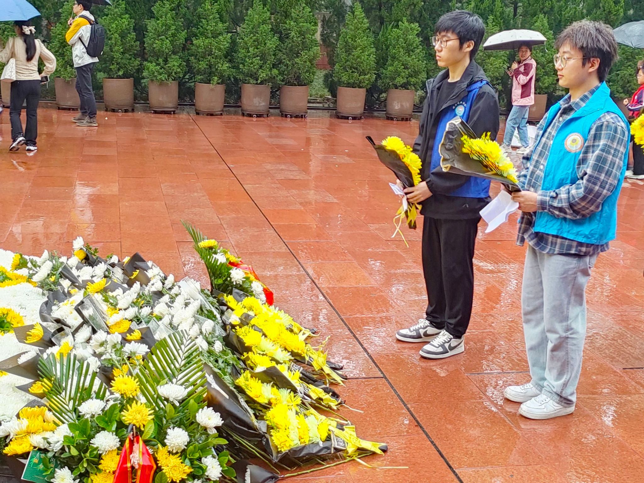 接下来,志愿者们在主持人带领下进行一分钟的默哀,表达对 “生前无悔,死亦无悔”的烈士们的无尽崇仰与思念。黄花映射天地情,岁月变迁承思韵。活动的最后,志愿者献上自己亲手制作的小白花与小菊花束,有序绕纪念碑一周,瞻仰纪念碑,寄托无尽的哀思。