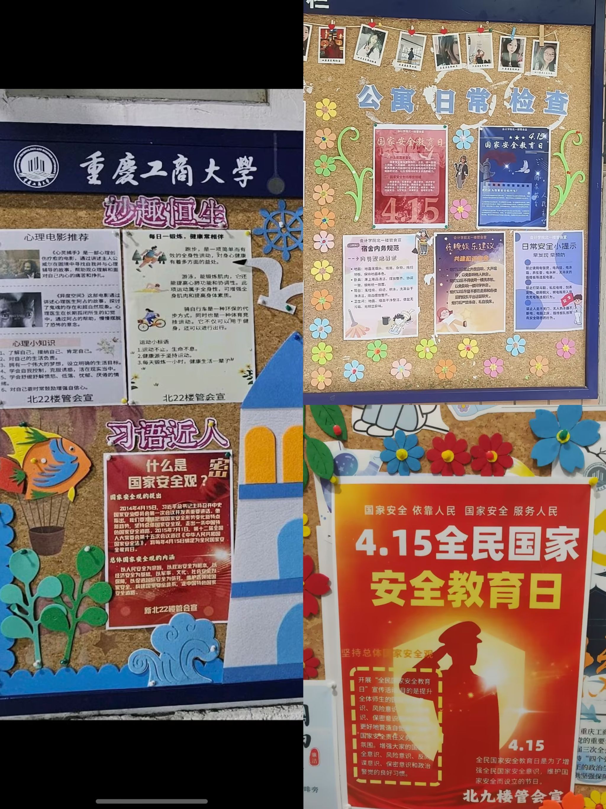 系列活动二:国家安全进学生公寓。OK138太阳集团坚持把国家安全教育纳入学生的日常学习生活中,积极拓展师生线下学习国家安全知识的渠道。4月15日,学院紧扣国家安全教育工作主旨,依托主体楼栋育人阵地,开展国家安全主题宣传活动。一方面,联合分管的楼栋,在北一、北九、北二十二公寓楼栋宣传栏及学院学生工作公示栏张贴主题宣传海报,开设国家安全教育专栏,吸引了众多同学驻足观看;另一方面,通过转载、推送国家安全教育、总体国家安全观知识至各班级群,线上线下营造了浓厚的国家安全教育氛围。