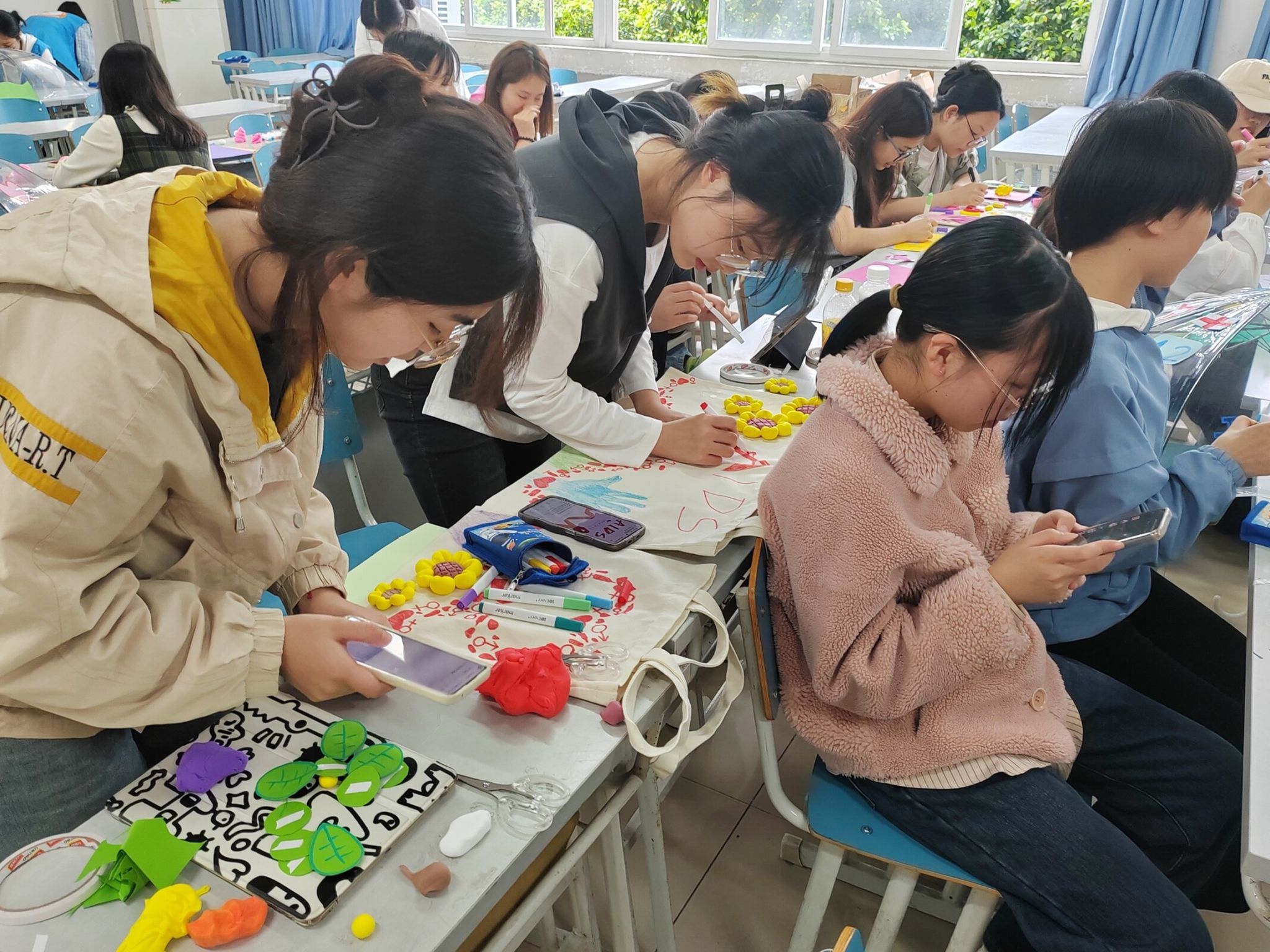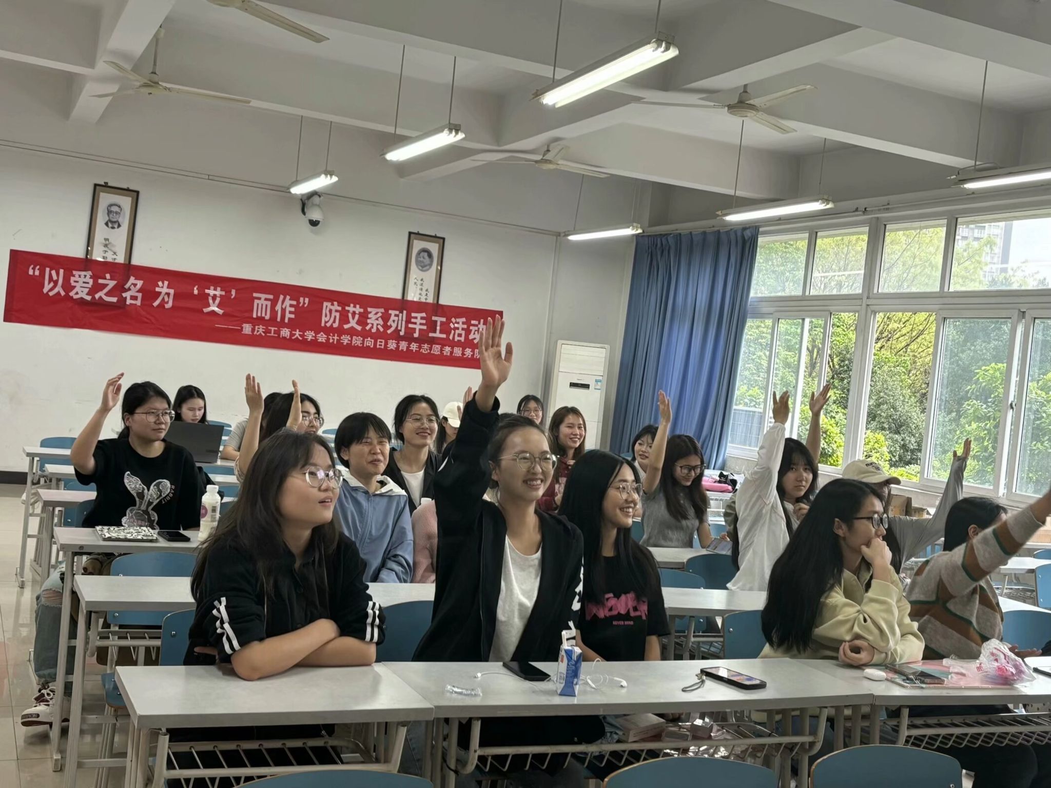 4日21日14:00,创意手工大赛在江北校区宏智楼B405教室正式开展。在现场创作的环节中,同学们运用自己丰富的想象力,将知艾防艾的意识凝于指尖,融入画里:代表着温暖和希望的向日葵绽放在指尖,象征着关爱艾滋患者的红丝带在笔下飘扬,明亮的星星在画中闪烁,“防艾不防爱”的反歧视标语写在画布上,烙印在同学们心中。创作环节结束后,青队特别设置了举手抢答的环节,题目涵盖艾滋传播、预防、治疗等多个方面。在竞答环节中,各个小组都十分积极踊跃,力争在该环节中展现出最佳的表现,经过激烈的角逐,最终选出了优胜小组,并为他们颁发了礼品。此次活动开展顺利,同学们在艺术创作中感受到了实践的乐趣,更增强了防艾意识。
