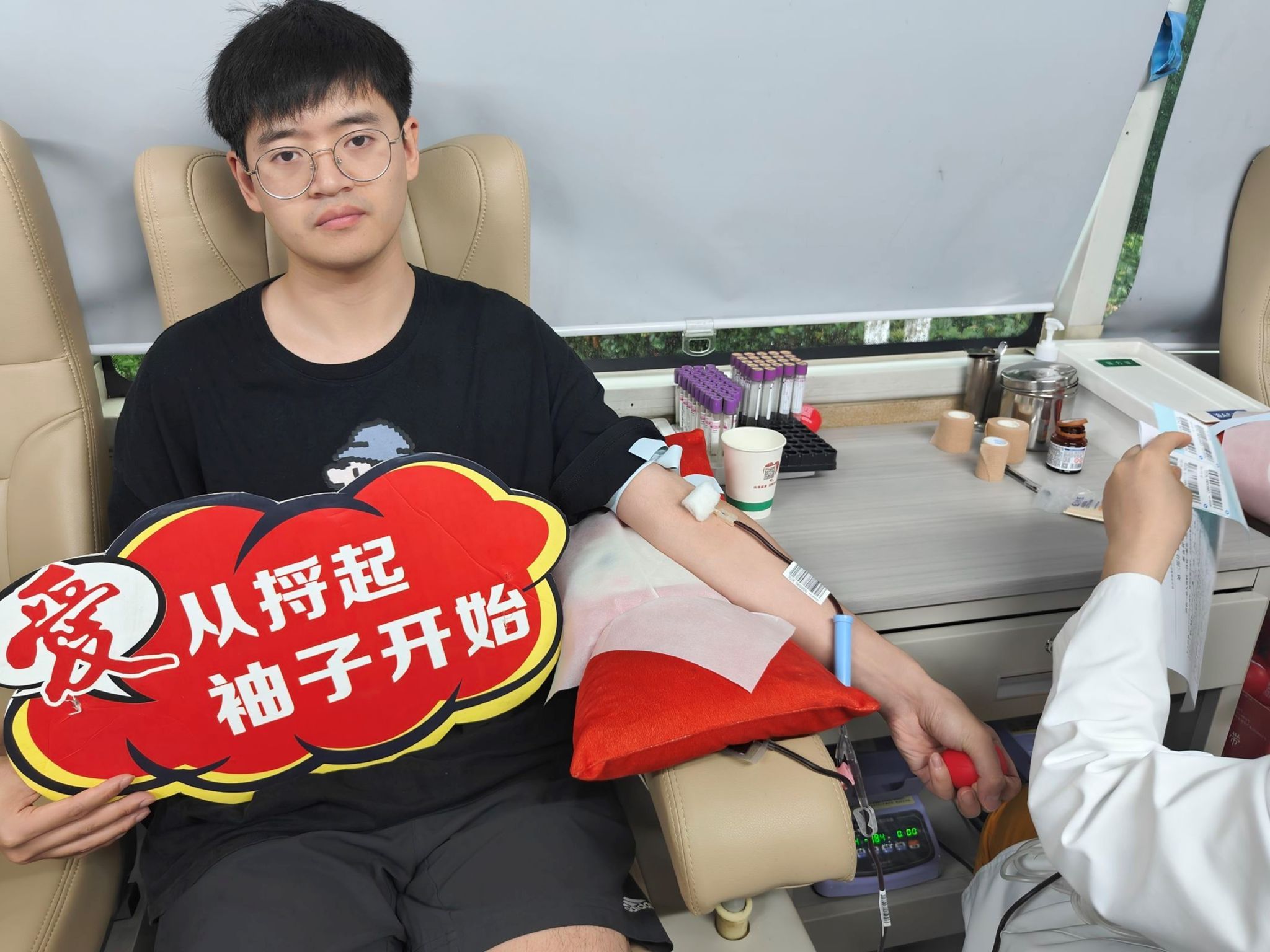 值得一提的是,许多前来献血的师生并非首次献血,正在休息区域的林同学接受了志愿者的采访,他回答道:“一点热血浓,千里生命缘。这是我第二次参与无偿献血活动了,这两次献血的经历让我感受到生命的珍贵,希望我的血液能在未来的某天帮助到需要的患者,更希望通过我的行动,鼓励更多的人加入到献血的行列中来。”