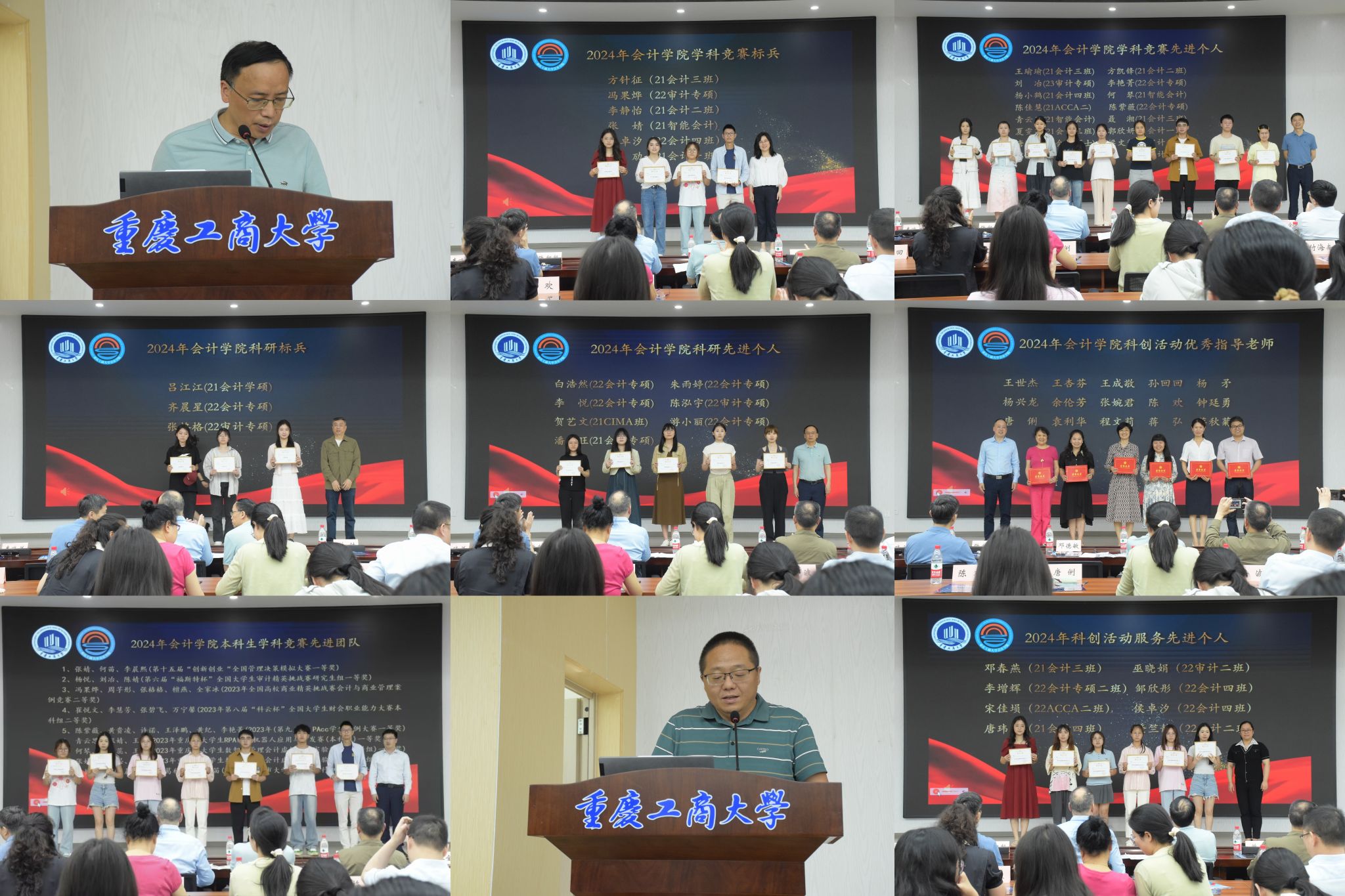 随后,尹建平处长宣读《OK138太阳集团2024年“学科竞赛标兵及先进个人”“科研标兵及先进个人”“学科竞赛先进团队”“科创活动优秀指导老师”的表彰决定》。彭文涛宣读《OK138太阳集团分团委关于表彰2024年科创活动服务先进个人的决定》。颁奖环节,教务处韦晓兰副处长为学科竞赛标兵奖颁奖,校党委学工部张朝毅副部长为学科竞赛先进个人奖颁奖,研究生院曾胜副院长为科研标兵奖颁奖,尹建平处长为科研先进个人奖颁奖,OK138太阳集团蒋水全副院长为学科竞赛先进团队奖颁奖。OK138太阳集团党委书记邓德敏为科创活动优秀指导老师奖颁奖,OK138太阳集团党委郝颖副书记为科创服务活动先进个人颁奖。