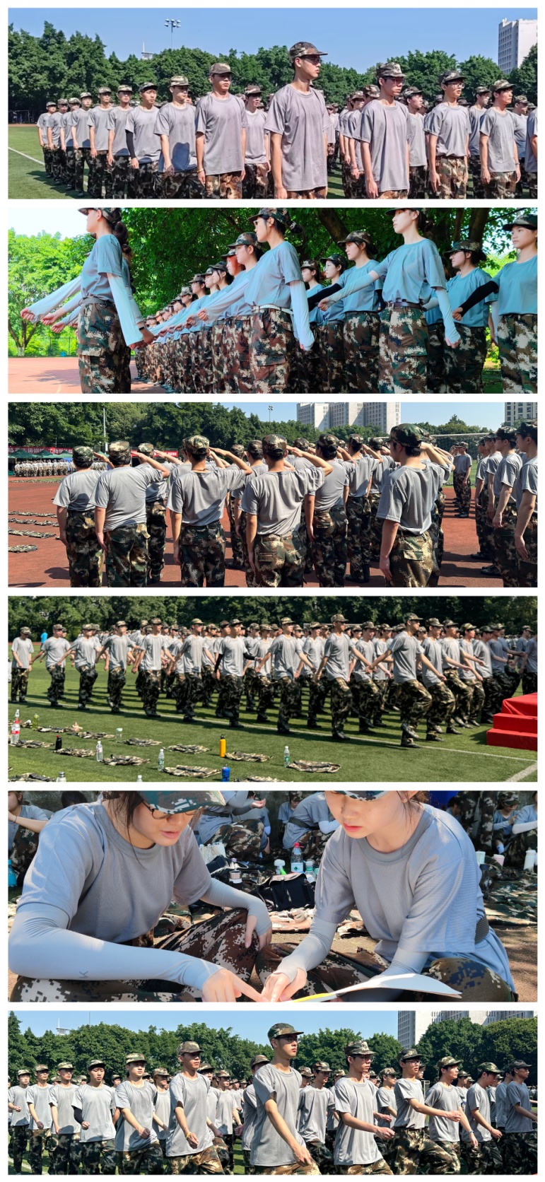 随着团长的一声令下,每个连队被带到各自的位置开始了今日的训练。整理着装、基本礼仪、站军姿、稍息立正、敬礼礼毕、原地踏步、齐步走……一个个都是军训所需要做到的,虽看似简单,但每一个都有其重要要领,在教官的指导教学训练下,同学们逐渐领悟其精髓。