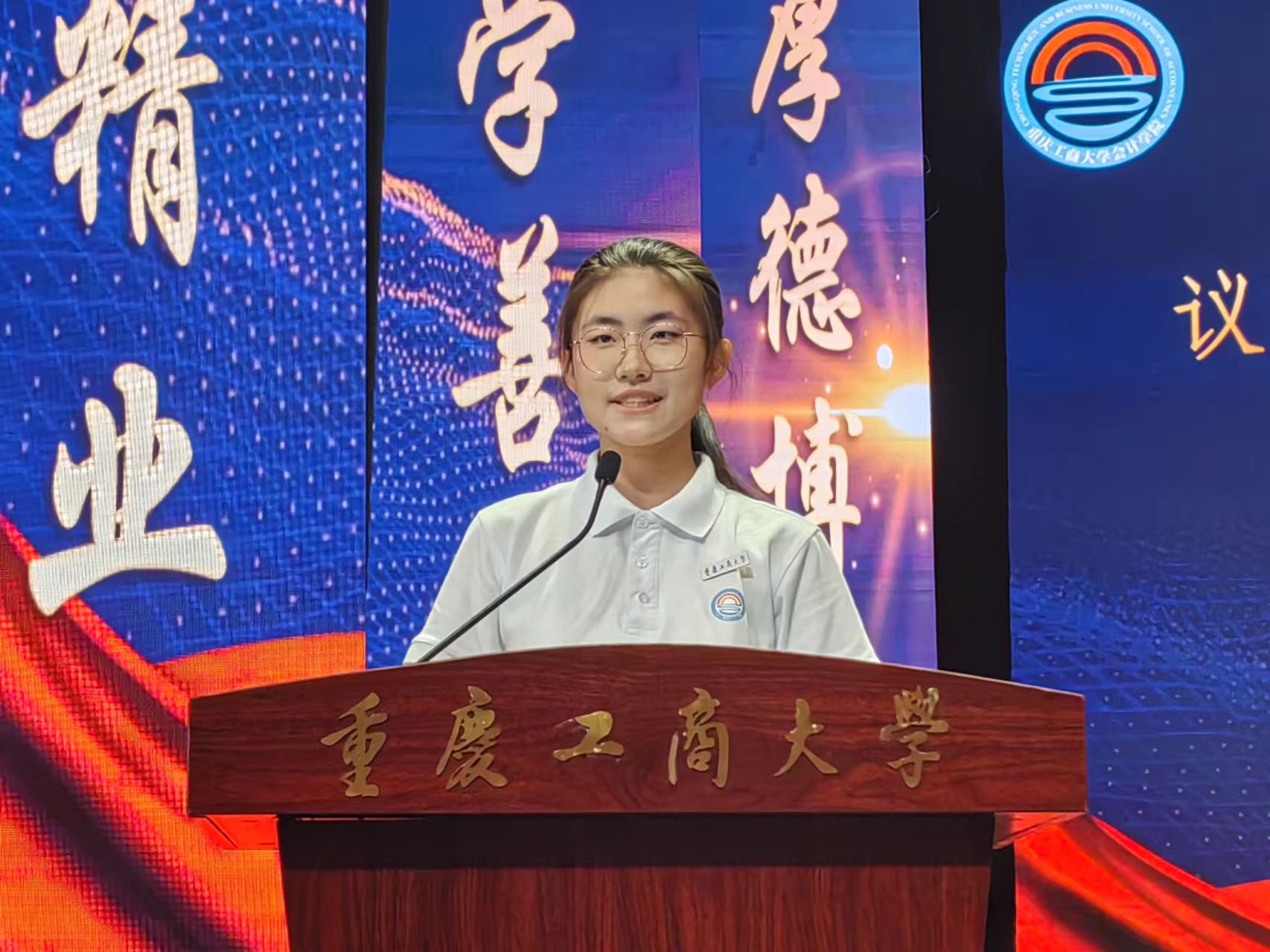 2023级会计学二班王晨钰同学作为学生代表登台发言。她分享了自己在学习和生活中的宝贵经验,以自身的成长历程激励着新同学们勇敢面对挑战,努力追求卓越。