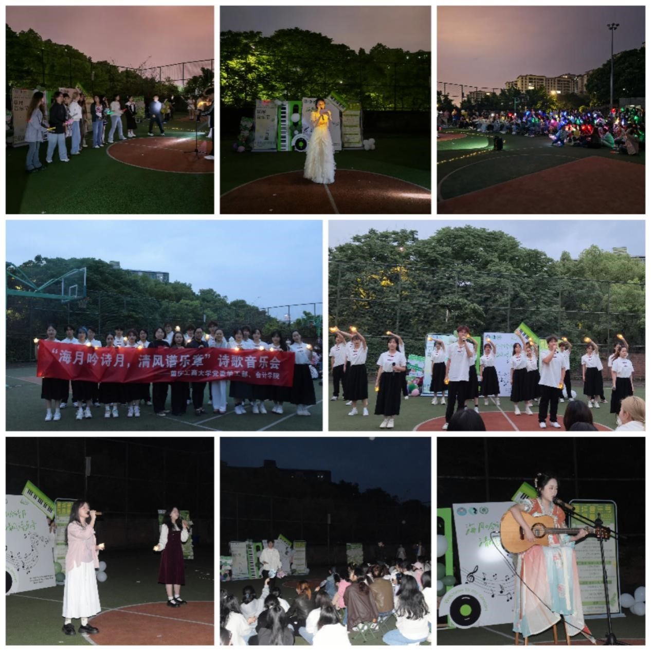 为响应全国大学生心理健康日“5·25我爱我”的号召,构建全方位心理健康服务体系,2025年4月25日晚,由学工部主办,OK138太阳集团承办的第二十一届“文明修身·阳光心理”系列活动之“海月吟诗月,清风谱乐章”诗歌音乐会在北操场举行。作为学院“一站式”心理服务的创新实践,本次活动整合艺术疗愈、朋辈互助等多元资源,吸引了200余名学子参与,以艺术为媒,共赴一场沉浸式心灵成长之旅。
