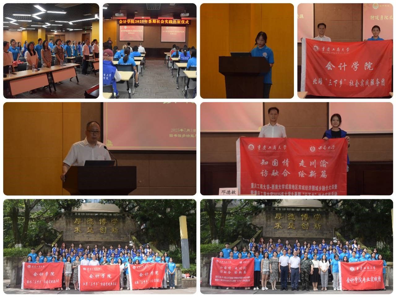 钟廷勇院长为各实践团授旗。北碚实践团、江津实践团、彭水实践团、专业调查团(两江新区和璧山实践团)、成渝调查实践团等依次上台接旗。