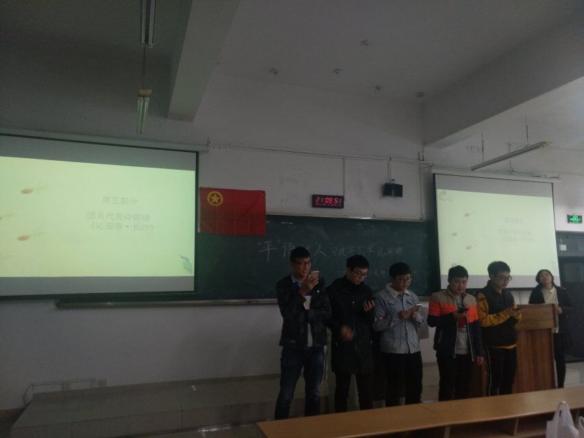 活动开始,全体成员奏唱团歌。同学们站立挺拔,神情肃敬,胸前的团徽闪耀着共青团员的朝气与力量。活动共分为六个部分。第一部分,同学们观看了中国梦与当代流行歌曲相结合的相关视频,同学们在视频里听了《望春风》、《众生花》、《水调歌头》和《中国人》等现代歌曲,里面传统诗歌的引用与爱国主义的流露深深吸引了同学们,同学们情不自禁地跟着唱了起来,视频还表达了如今新青年对中国梦的颂扬。第二部分,我们开展了关于“中国梦”的知识竞赛活动,同学们积极参与,踊跃作答。第三部分,我们观看了“平语近人,习近平总书记用典”第八集的视频,,生动传神,寓意深邃,极具启迪意义,激发了同学们对中国传统文化的热情。第四部分,播放了校园采访视频“你的青春梦是什么”。视频中随机被采访的同学都能说出自己的梦想与想法.第五部分,团员代表朗诵《沁园春·长沙》。上场的团员代表声情并茂的朗诵深深震撼了台下的同学们,音调的高低、音量的大小、声音的强弱、速度的快慢,有对比、有起伏、有变化,使整个朗诵犹如一曲优美的乐章,展现了那峥嵘岁月里,少年们的才华横溢,意气风发。第六部分,我们选出三组同学参与了“你画我猜”的小游戏,同学们热情高涨,争先恐后的参与活动,玩得不亦乐乎,小游戏活跃了氛围,增强了同学们的集体参与感,使整个支部更加团结友爱。