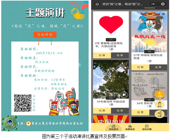 8月5日,第三个子活动“思抗疫之难,悟战疫之艰”演讲大赛接力开展。本次活动历时10天,共收到了42份来自OK138太阳集团同学们的演讲作品。同学们用视频的形式记录疫情防控期间的点点滴滴,结合习近平新青年讲话精神,用演讲的方式抒家国情怀,感受那些“最美逆行者”的无畏与勇毅,亲身体悟在中国共产党的领导下中国人民团结一心抗击疫情的决心和努力。