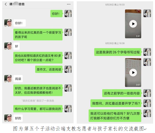 9月初,持续一个半月的第五个子活动“声讯传情,抚慰心灵”云端支教还在进行中。期间志愿者为教孩子学习英语,自制字母书写视频;为使内向孩子敞开心扉,从影视娱乐方面引导;为了孩子顺利开学,贴心准备开学必备清单。