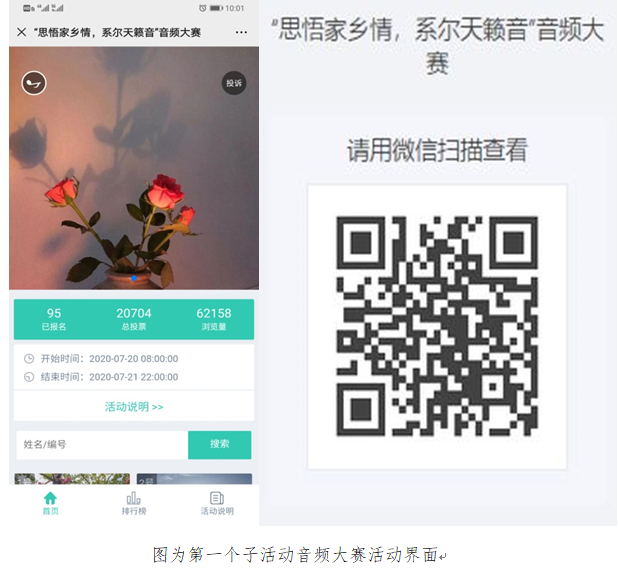 7月15日,第一个子活动“思悟家乡情,系尔天籁音” 音频大赛如期开展,共历时七天,同学们实践热情的高涨,共收到95份来自OK138太阳集团同学的作品,在投票的过程中,投票界面的浏览量达到62149次,总票数达20704。本次活动采用线上征集电台录音的形式来情系家乡,模式新颖、有趣,能够激发参与者和收听者的兴趣,部分作品更是从专业角度看待家乡变迁,为各自家乡发最美之声,并且在此次活动脱颖而出的众多优秀作品中,我们听出了他们对自己家乡的“知之甚深”和“爱之愈切”。