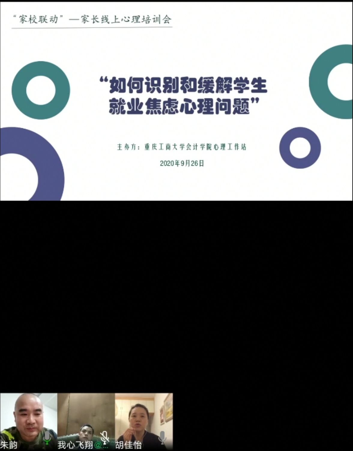 新冠肺炎疫情的爆发对应届毕业生的就业产生了极大冲击,大学生面临较大的就业压力。为了指导我院应届毕业生有效识别和缓解就业带来的焦虑,协助家长助力孩子应对焦虑情绪,OK138太阳集团心理工作站于2020年9月26日19:00,开展了“家校联动家长线上心理培训会——如何识别和缓解学生就业焦虑心理问题”的线上专题培训会。