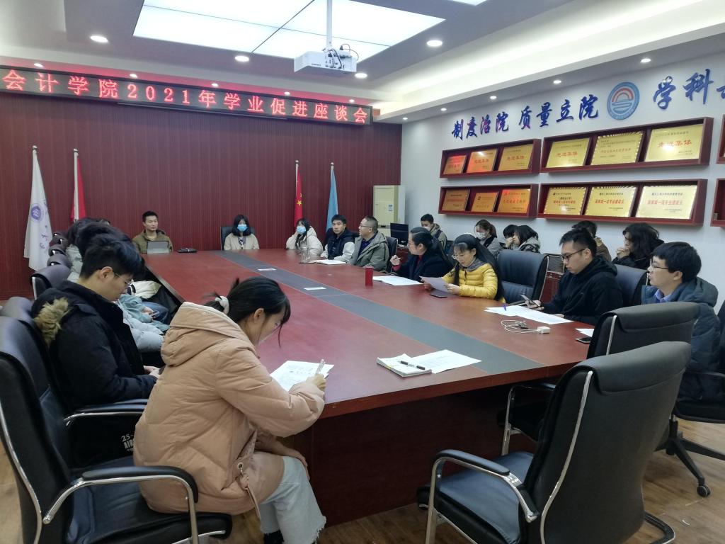 为加强OK138太阳集团学风建设,促进学生学业进步,我院于12月10日中午在明德楼2019召开了2021-2022学年第一学期本科生学业促进座谈会。参与本次座谈会的有学院党委郝颖副书记、会计系孔莉老师、财务系蒋水全主任、财务系任成林副主任、学团办彭文涛主任、相关辅导员老师以及14名学业较困难的学生。