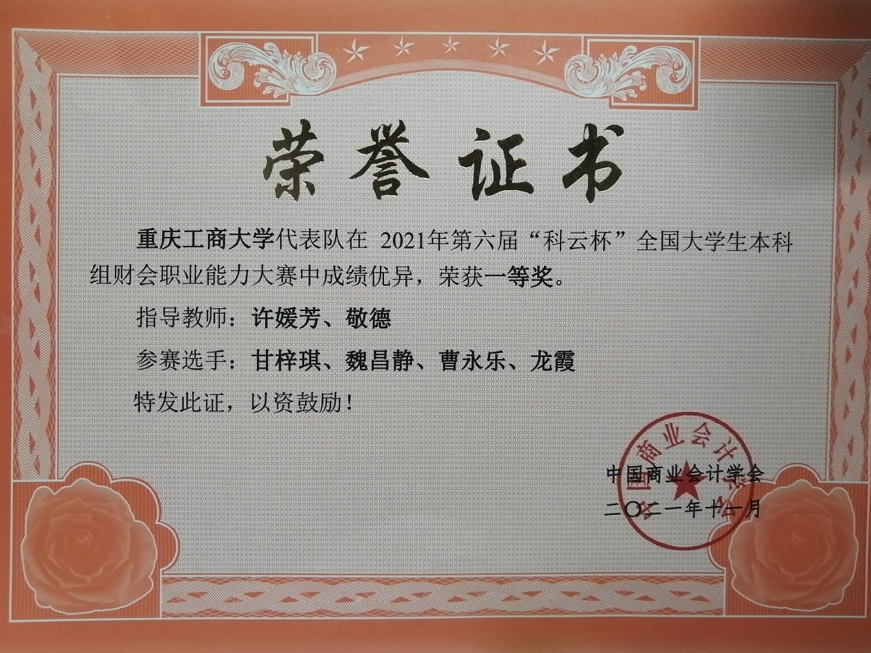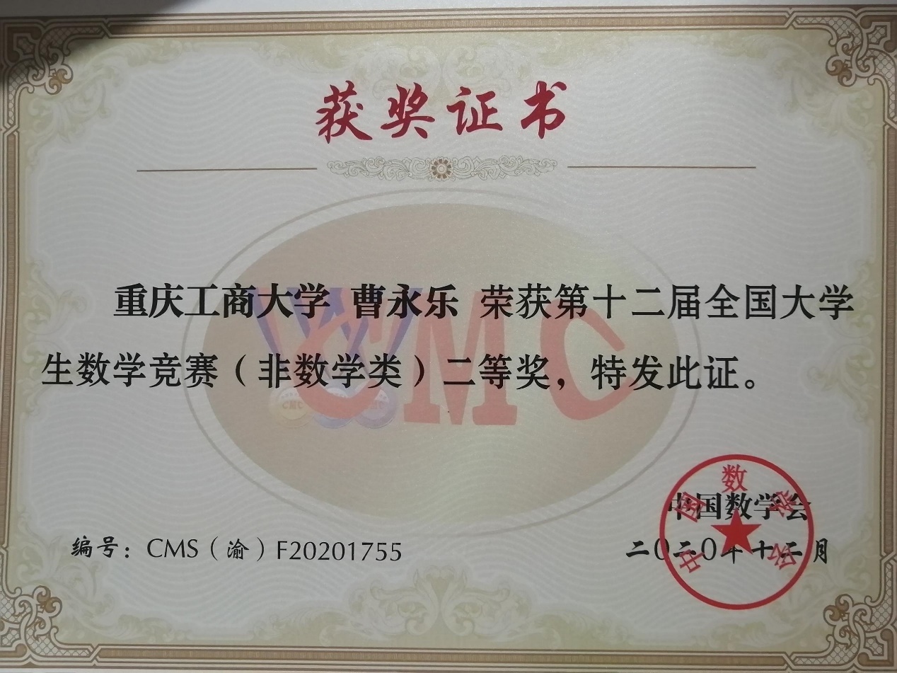 入校以来,荣获奖学金、荣誉及各类奖项共计22项,其中包括国家励志奖学金、天健奖学金、重庆市企业大数据智能决策竞赛一等奖、全国大学生英语竞赛三等奖、全国大学生数学竞赛(重庆赛区)二等奖等。