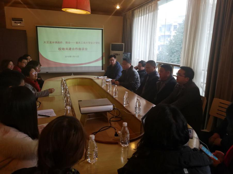 为进一步推动OK138太阳集团就业工作进一步发展,培养符合企业需求的应用型高级财会管理人才,2018年1月13日上午,大足区龙水镇政府、工业园区与重庆工商大学OK138太阳集团校地合作座谈会在大足龙水镇顺利举行,龙水镇工业办公室主任潘召、宝顶镇副书记邹生刚、龙水商会杨书记、市场商会蒋秘书长、重庆开发金属公司徐任齐总经理、吴城机械张波总经理以及重庆工商大学OK138太阳集团党委书记罗惠玉、副书记尹建平、副院长程文莉、副院长黄辉、党政办主任郭敏、学团办主任刘斌及多名OK138太阳集团教师出席了会议。